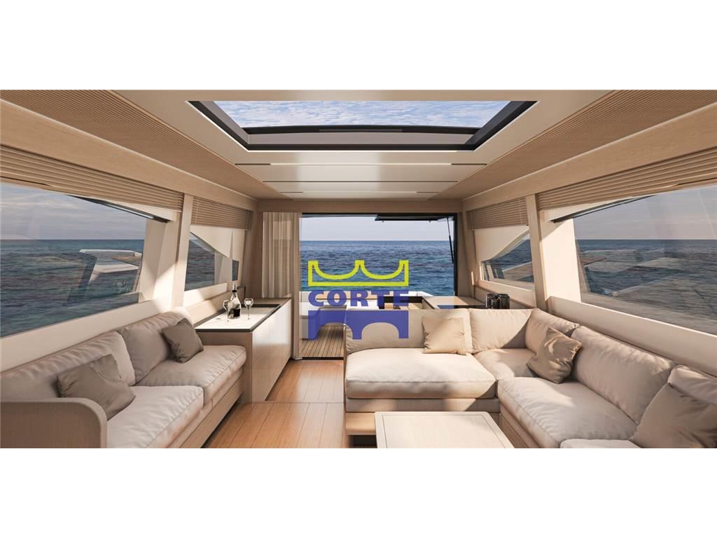 Acqua Calda, Antenna Satellitare TV, Aria condizionata (tropicale), Boiler (elettrico scambiatore), Clima reversibile, Congelatore (35 l in dinette), Cucina, Cuscineria completa, Dissalatore (130 l/h IDROMAR), 2 Frigorifero interno, Impianto acque nere, Impianto TV, Indicatore del serbatoio del carburante, Indicatore del Serbatoio dell’Acqua, Indicatore della pressione dell’olio nel motore, Indicatore della temperatura del motore, Inverter, Lavasciuga, Lavastoviglie, Piastra in vetroceramica, Prese interne 12v, Prese interne 220v, Stereo, Telecamera, Teli copri finestra (parabrezza di prua e vetri tuga), Tendalino (di prua con pali estraibili e di poppa elettrico integrato nel T-Top), 4 TV, WC marino elettrico, Winecooler, Coperta in teak naturale con comento nero, controllo passerella tramite app, sistema di varo tender con rulli e verricello elettrico, faro elettrico, cartografia Garmin