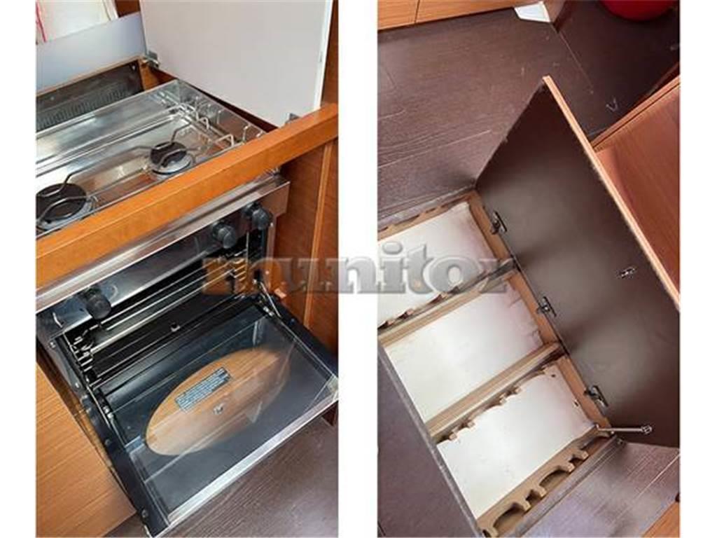 Impianto audio, Pilota automatico, Piattaforma da bagno, Caricabatterie, Barbecue, Tenda bimini, Elica di prua, Doccia in pozzetto, Bussola, Ecoscandaglio, Verricello elettrico, Parabordi, Plotter GPS, Impianto acqua calda, TV LCD, Forno, Frigorifero, Divani in pelle, Sprayhood, Teak a poppa, Fornello, Teak in pozzetto, VHF, Indicatore di vento