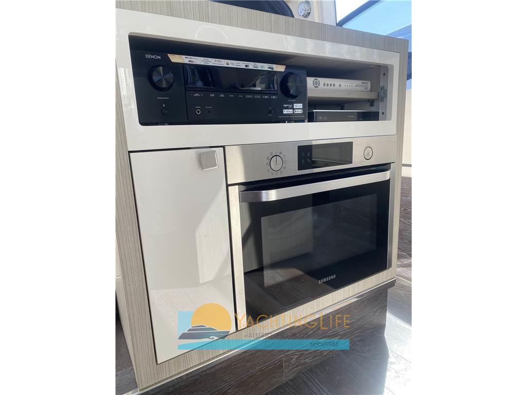 Altoparlanti, Antenna Satellitare TV, Aria condizionata, Boiler, Cassaforte, Congelatore, Cucina, Cuscineria completa, Decoder satellite, Frigorifero esterno, 2 Frigorifero interno, Home Theater, ICE Maker, Impianto acque nere, Impianto TV, Inverter, Lavastoviglie, Lavatrice, Meccanismo saliscendi per TV, Microonde, Pavimento interno in legno, Piastra in vetroceramica, Prese interne 12v, Prese interne 220v, Ricevitore satellitare, Riscaldamento, Stereo, Teli copri finestra, Tendalino, 4 TV, 3 WC marino elettrico, Zattera di salvataggio