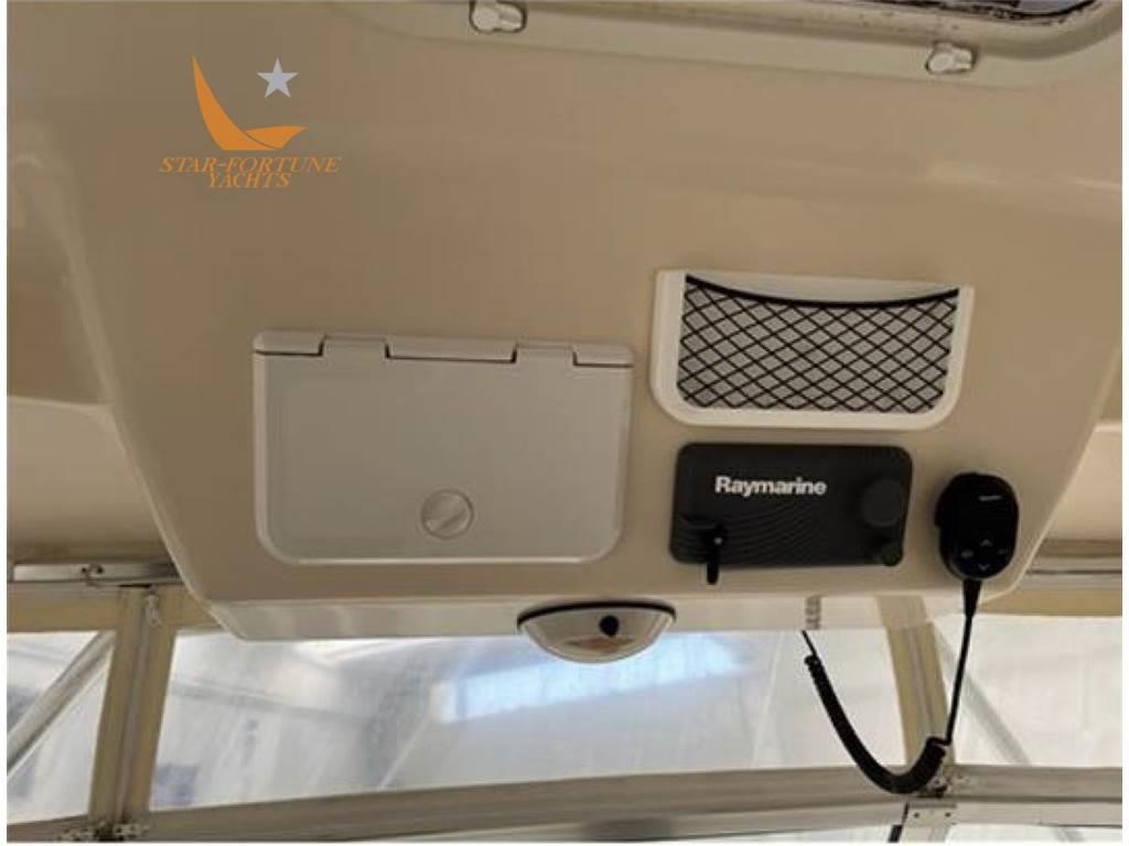 Allarme motore, Ancora, Autoclave, Batterie, Bussola, Caricabatterie, Computer di bordo, Doccia esterna, Ecoscandaglio, Elica di prua - bow thruster, Flap idraulici, GPS, Piattaforma, Pilota automatico, Plotter con antenna GPS, Pompa di sentina automatica, Porta ingresso, Presa 220V banchina, Radar, Radio VHF, Salpa Ancore Elettrico, Scaletta da bagno, T-Top