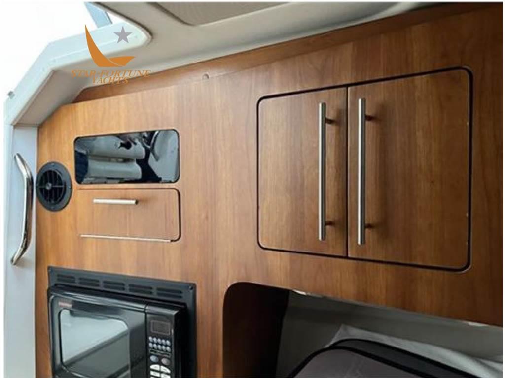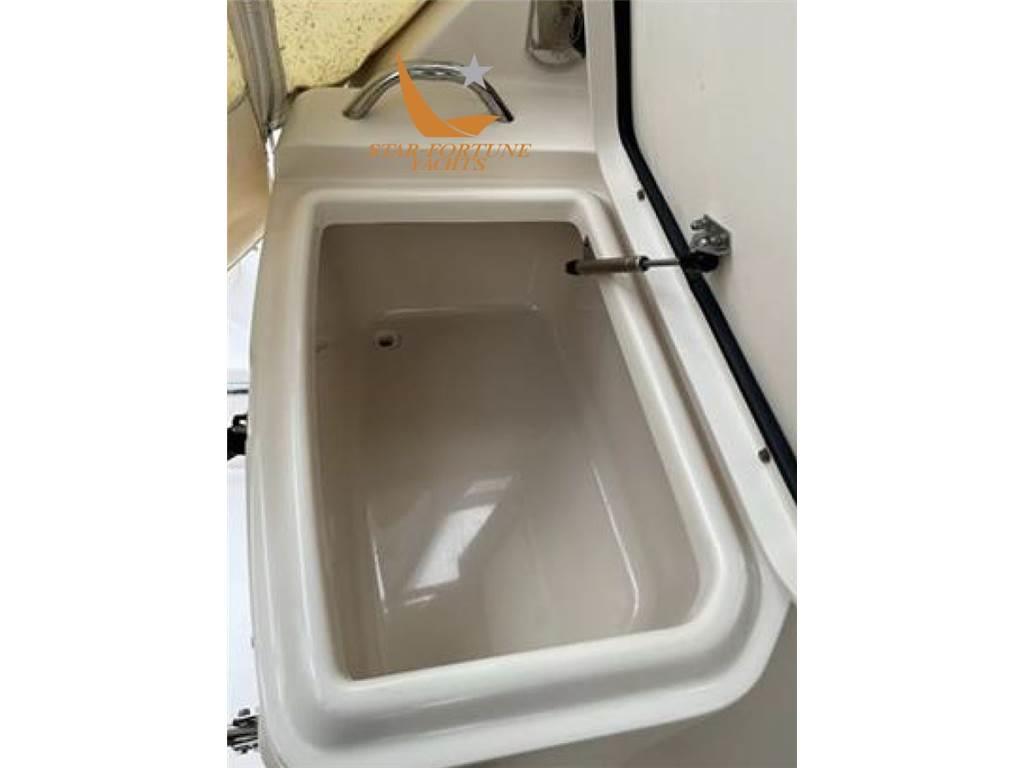 BBQ/ Grill, Cucina, Cuscineria completa, Frigorifero interno, Impianto acque nere, Impianto TV, Microonde, Piastra in vetroceramica, Portacanne, Prese interne 220v, Serbatoio Acque Nere, Stereo, Teli chiusura T-Top, TV, Vasca del vivo, Vasca pescato, WC marino elettrico