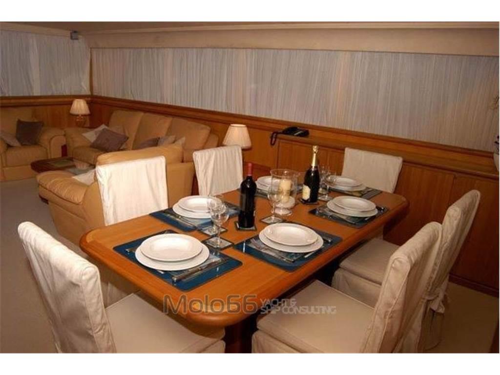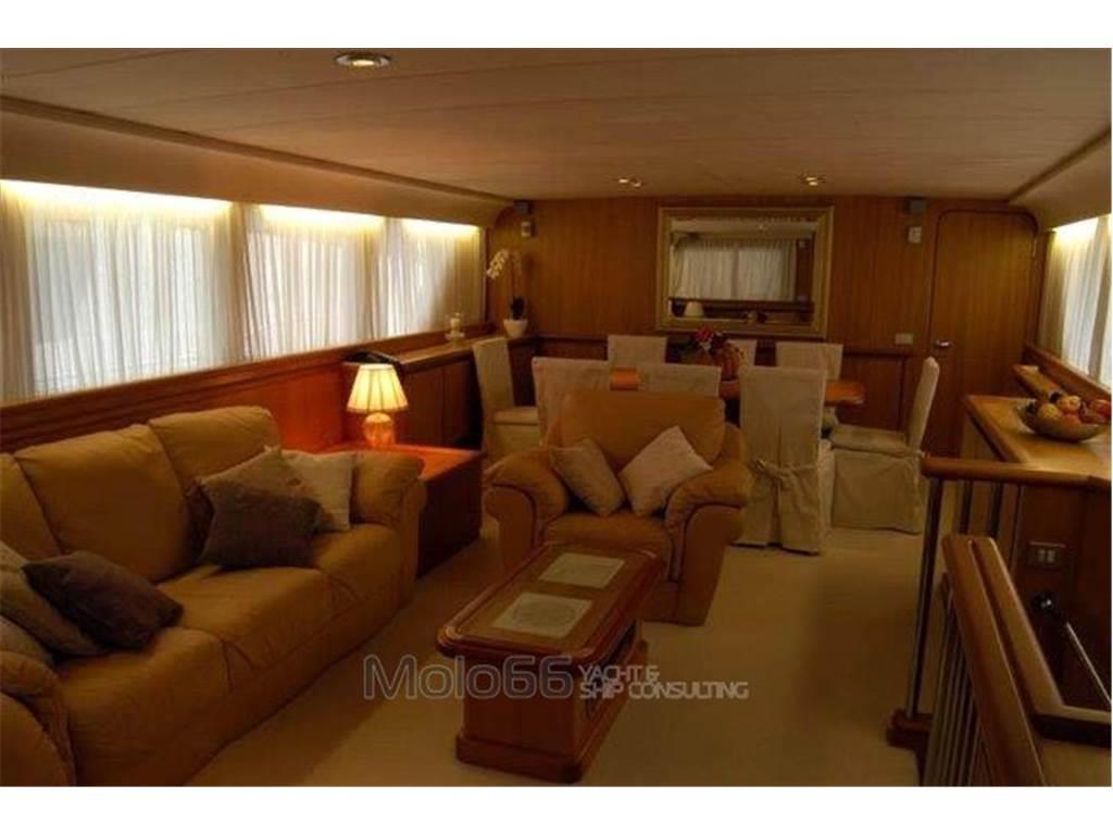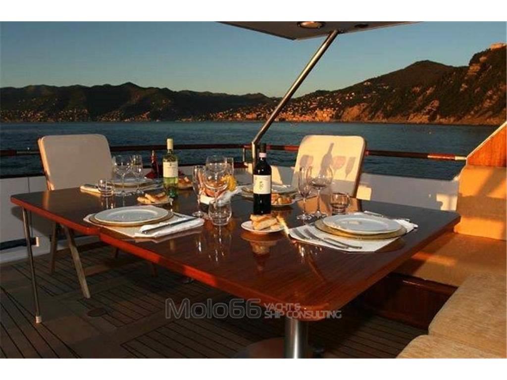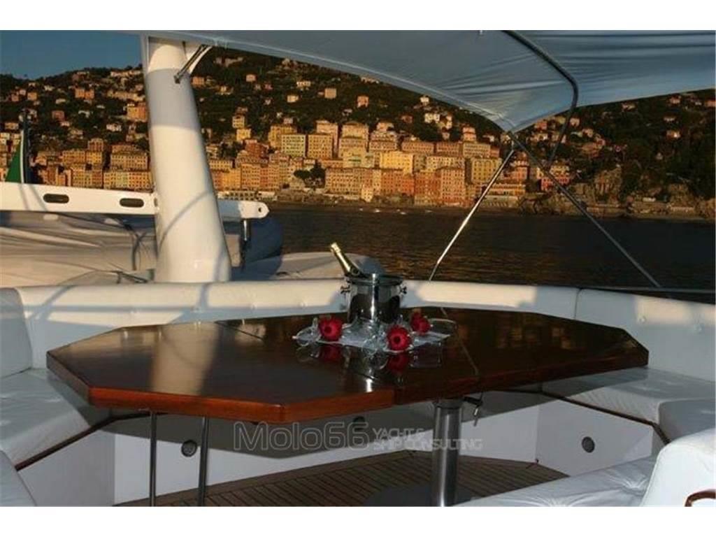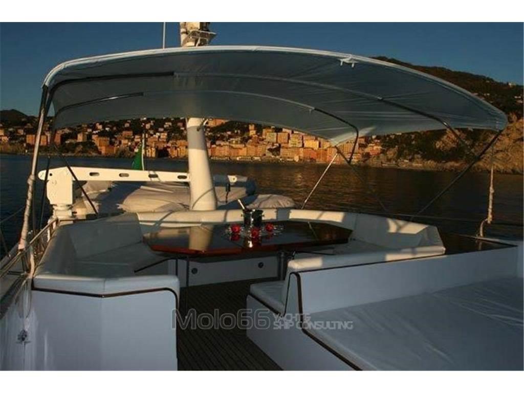 2 Autoclave, 2 Bussola (Sperry + Azimut 1000), 2 GPS (Furuno GP50 + Lorenz 11''), 2 Radio VHF (Icom IC-M127 + Sailor Rt146), Allarme motore, Allarme sentina, Ancora, Batterie, Camminamenti laterali in teak, Caricabatterie, Doccia esterna, Doppia timoneria, Ecoscandaglio (Furuno Ls 6100), Faro orientabile, Fax, Gruette per tender su fly, Impianto antincendio, MeteoFax (Furuno 208), Passerella (Gandola), Piattaforma, Pilota automatico (Furuno Fap 330), Pompa di sentina automatica, Pompa di sentina elettrica, Pompa di sentina manuale, Pozzetto Teak, Presa 220V banchina, Salpa Ancore Idraulico, Scaletta bagno, SSB (Skanti)