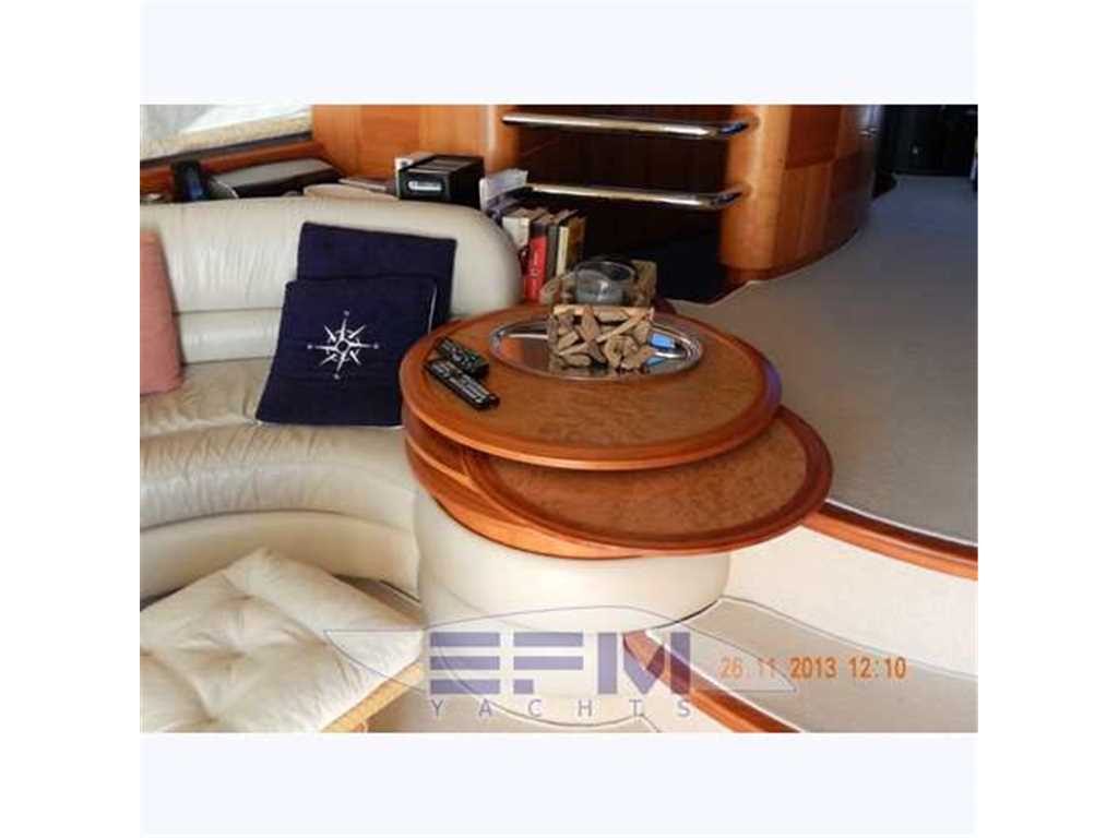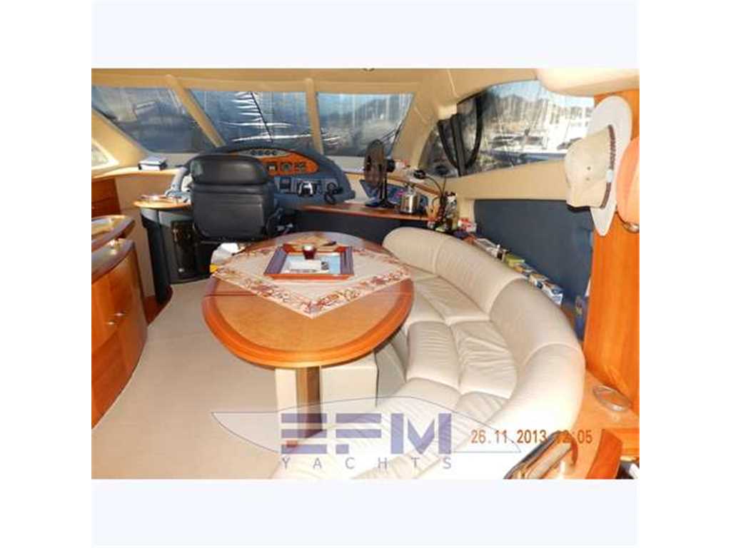 Interni classici in ciliegio satinato e con inserti e divanerie in pelle e rivestimenti color crema. Spaziosa Cabina Armatoriale a centro barca resa ancora piu' luminosa dalle ampie finestrature a murata caratteristiche del modello Evolution , grande letto matrimoniale ad isola con mobile scrittoio e con bagno privato con ampio lavabo, bidet e wc con box doccia separato - Cabina vip con letto matrimoniale e bagno privato ad estrema prua con mobile lavabo bidet e wc e box doccia separato - cabina ospiti con 2 letti in piano + 3 letto a castello a tuuto baglio e accesso esterno al bagno di prua - moquette chiara nella zona notte - cabina equipaggio con letti singoli e servizio ad estrema poppa - cucina completa con piastra elettrica a 4 fuochi, microonde, frigorifero 130 lt , lavastoviglie - 1 frigobar nella dinette esterna ed 1 frigo nel fly - icemaker - salone con divaneria a "c" in pelle crema e tavolo in ciliegio satinato - dinette con ampio divano semicircolare e grande tavolo da pranzo abbattibile in legno - Ampio pozzetto in teak - Mobile cucina completo sul fly composto da lavabo, frigo e barbecue -