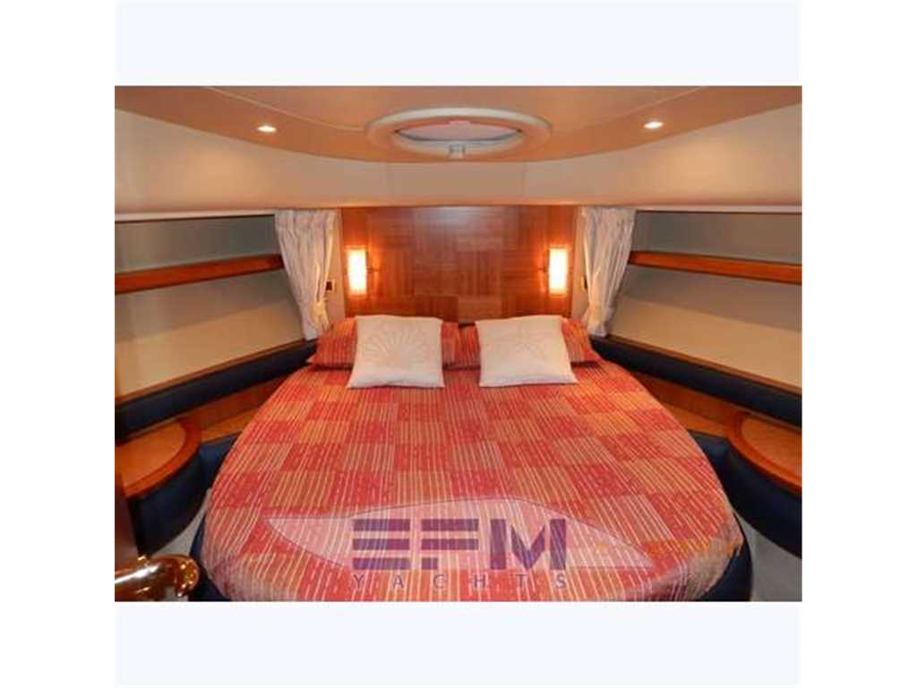 Cabina armatore a centro barca con matrimoniale, armadio a doppia anta, vanity con scrittoio, bagno privato completo di coccia separata. Cabina VIP a prua con matrimoniale, un armadio per lato, bagno. Cabina ospiti di dritta con letti in piano, armadio a murata. Locale servizi per VIP e ospiti con doppio accesso completo di doccia. Salone, a dritta, con mobile in ciliegio e radica, icemaker, storage, TV color con VCR e bar con porta bottiglie in plexiglas, divano a C a sinistra con tavolino integrato rotante, stereo. Dinette su secondo livello a dritta verso proravia con divano pranzo e tavolo in ciliegio con parte centrale amovibile. Cucina, sulla sinistra, contrapposta alla dinette. Cabina marinaio con un letto e wc.