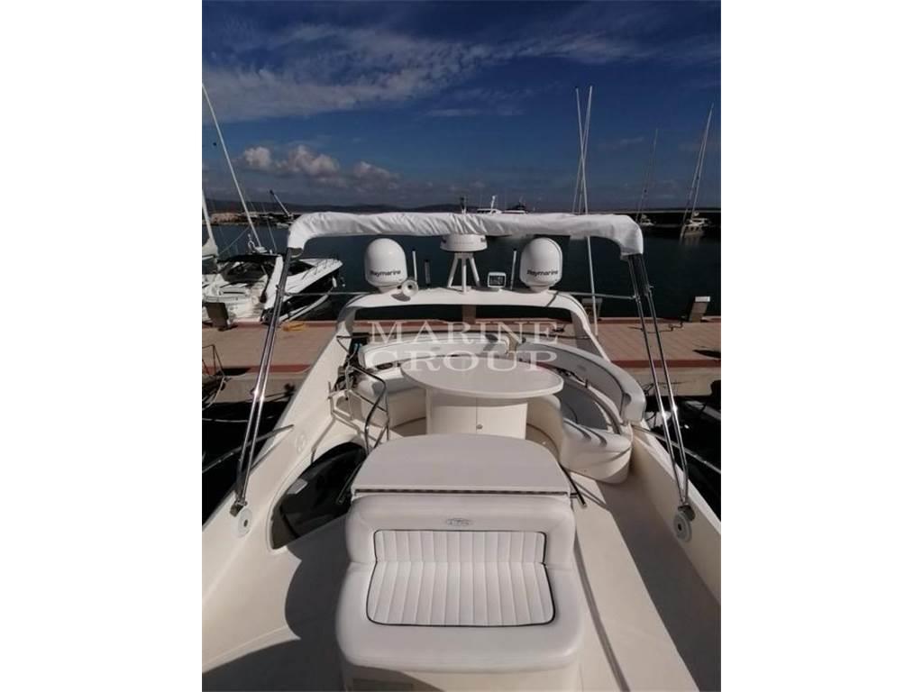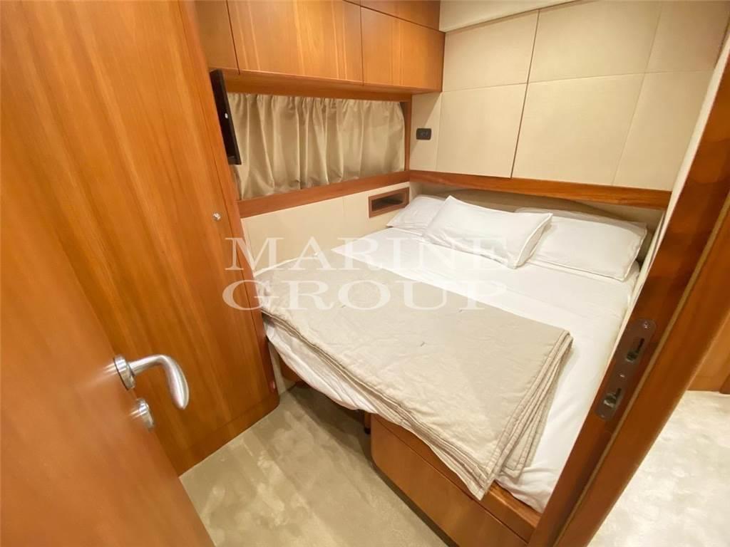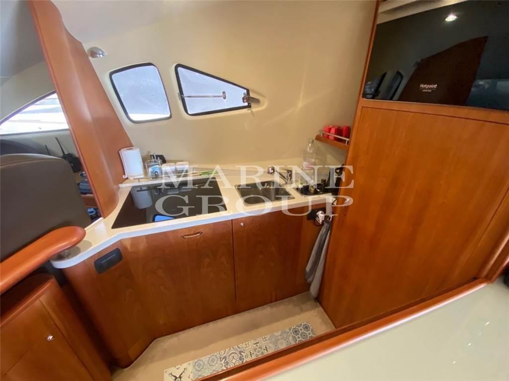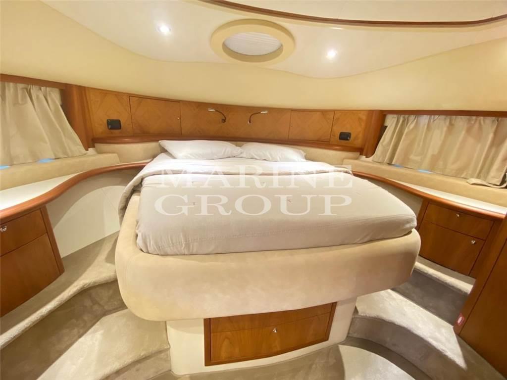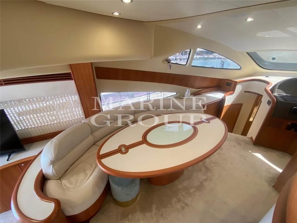 Interni in essenza di ciliegio e moquette; Ampio divano a "U" in pelle chiara con tavolo da caffè: Cucina completamente attrezzata, sala da pranzo con divano in pelle; Cabina armatoriale a centro barca a tutto baglio con bagno privato ensuite completo di box doccia e bidet; Cabina VIP a prua ampia e luminosa con bagno privato compreso di box doccia; Cabina ospiti con due letti in piano trasformabile in matrimoniale, terzo bagno completo; Cabina marinaio a poppa con bagno e ingresso indipendente dalla seduta del divano del pozzetto.