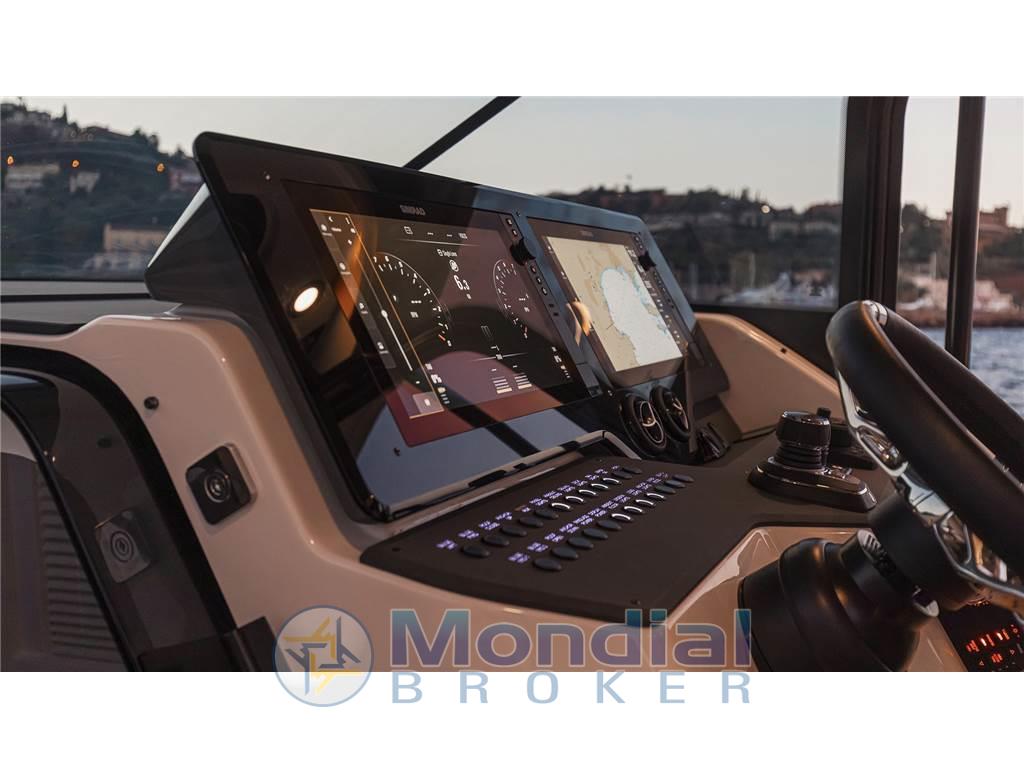 AIS, 2 Allarme motore, Allarme sentina, Alternatore, Ancora, Auto Dynamic Trim Interceptor, Autoclave, Auto-Trim, 4 Batterie, Bitte Abbattibili, Bussola, Camminamenti laterali in teak (Sintetico), Caricabatterie (Mastervolt), Cavo corrente di banchina, Computer di bordo, Corrimano, 2 Display (Simrad), Doccia esterna, DSC vhf, Ecoscandaglio, Elica di prua - bow thruster, Flap elettrici (Lenco), GPS, Hard top, Indicatori Flaps, Joystick, Lavandino nel Pozzetto, Luci di cortesia, Luci di navigazione, Luci subacquee, Monitor dei consumi, Parabordi, Plotter, Plotter con antenna GPS, 3 Pompa di sentina automatica, Pompa di sentina manuale, Ponte in teak (Sintetico), Porta ingresso, Pozzetto Teak (Sintetico), Presa 220V banchina, Presa acqua banchina, Quadro comandi, Radar, Raddrizzatore, Radio VHF, Salpa Ancore Elettrico, Scaletta da bagno, Sedile Copilota, Tavolo pozzetto (Abbattibile), Tientibene con cancelletti
