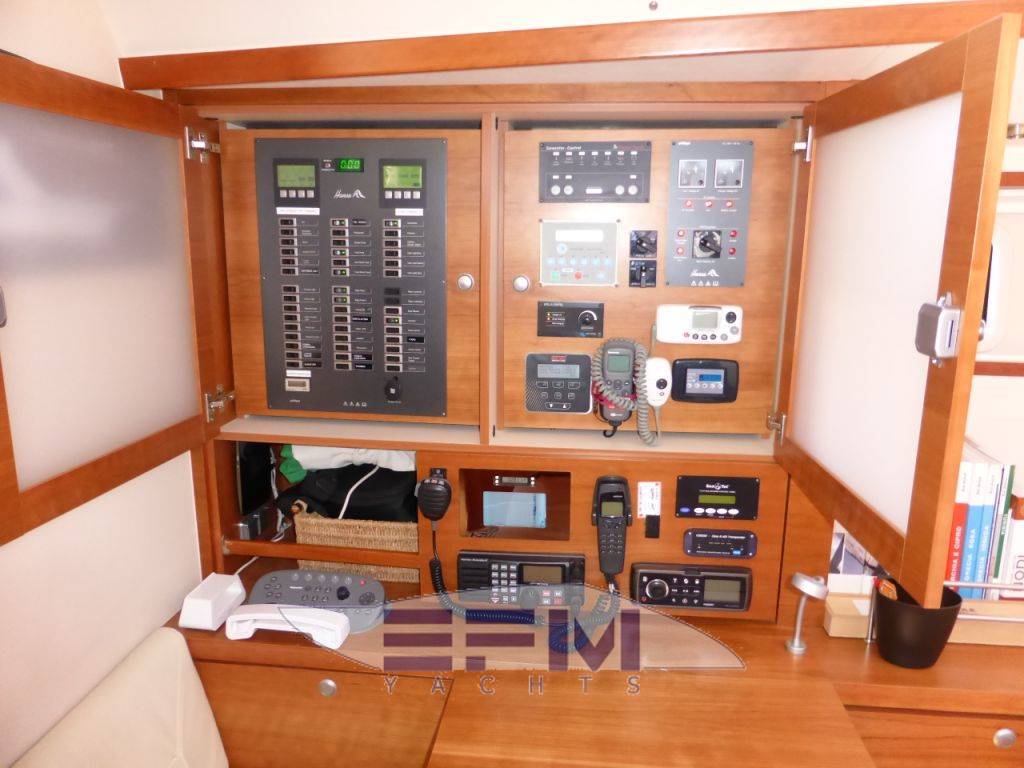 Strumentazione elettronica completa RAYMARINE, gps plotter cartografico a colori in timoneria e possibile visualizzazione nelle TV di bordo tramite apposita consolle anche come schermo radar - antenna radar RAYMARINE 48 mg. - 2 pilota automatico RAYMARINE con telecomando, 2 strumentazione vento RAYMARINE , 2 strumento multifunzione RAYMARINE - VHF RAYMARINE con DSC - log, ecoscandaglio - pack navigazione elettronica - impianto stereo - Comando in pozzetto per elica di manovra a prua - salpancora con telecomando a prua - 4 winches elettrici da 400 watt a 24 v. - impianto tv - comando salpancora elettrico anche in timoneria - dissalatore HP 200Lt/h - Lavasciuga - Lavastoviglie -