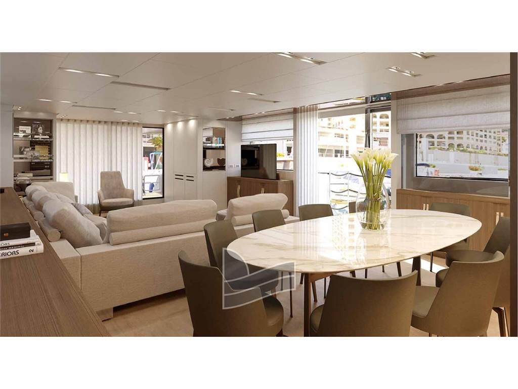 N. 2 tavoli con sistema elettrico hi-lo convertibili in 1 tavolo da pranzo nel pozzetto del ponte principale, con piano in teak e struttura in acciaio inox