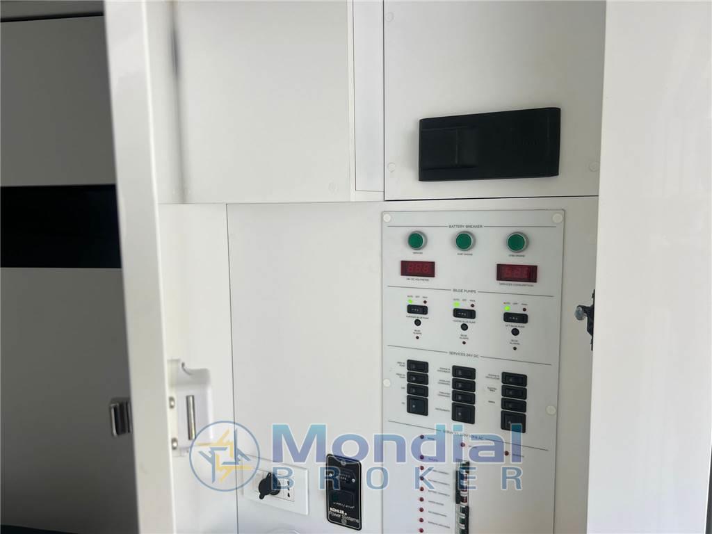 Acqua Calda, Aria condizionata, Bimini (SEMI AUTOMATICO), Boiler, Cucina, Cuscineria Pozzetto, Frigorifero esterno, Frigorifero interno, ICE Maker, Impianto acque nere, Indicatore del serbatoio del carburante, Indicatore del Serbatoio dell’Acqua, Inverter (2500 W), Prese interne 12v, Prese interne 220v, Serbatoio Acque Nere, Stereo (Premium VD Audio System), TV (CABINA DI POPPA), WC marino elettrico, PACCO BATTERIE SUPPLEMENTARI PER ELICA PRUA E POPPA