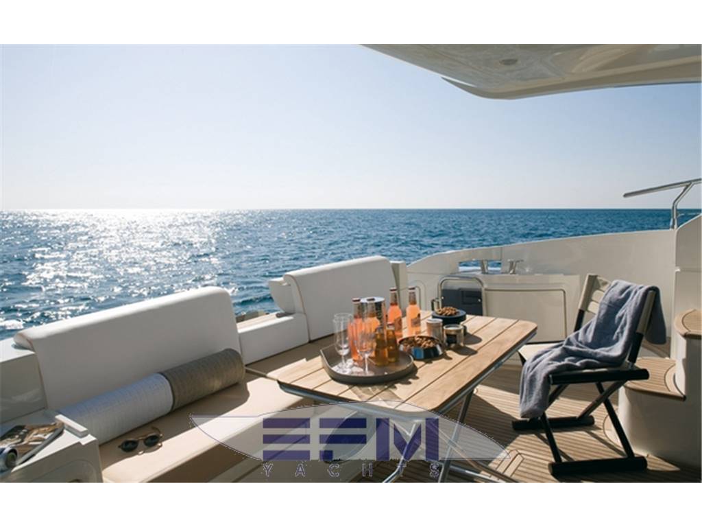 Il suo ampio ponte dispone di un grande salotto che parte in piena ampiezza a poppa per poi allungare verso prua e diventare una piattaforma spaziosa accanto al pilota. L'arco, largo e quadrato per aumentare il volume della cabina armatoriale, testimonia la personalità dello yacht "solare" con il suo solarium che può ospitare due persone. La cabina di guida si invita a trascorrere piacevoli momenti di relax all'ombra del flybridge spazioso.