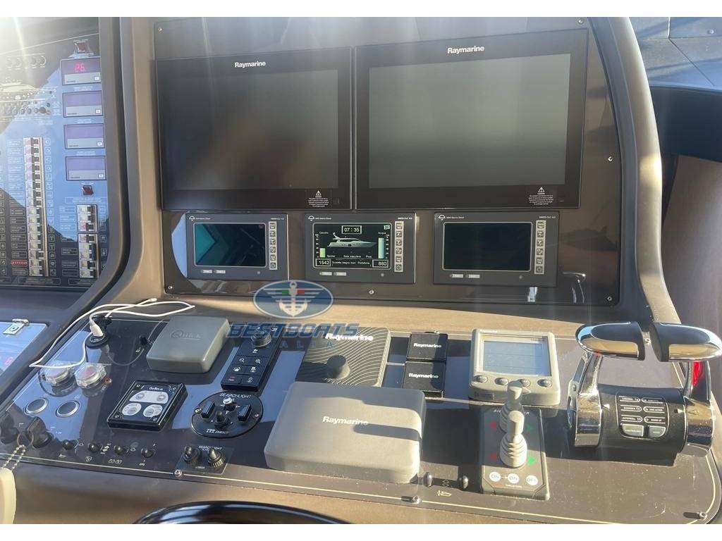 Pannello per la gestione di tutte le utenze; Allarme fumo/gas, Allarme motore, Allarme sentina, comando verricello Ancora, Doppio GPS Raymarine con diverse funzioni, Angolo barra, Bussola, Ecoscandaglio, Pilota automatico, Plotter, Radar, strumenti digitali per pressione olio, turbine, contagiri, ecc... Computer di bordo, Comando motori elettronico a leva, Contametri catena, Contamiglia, Radio VHF, Antenna radar, Display MAN, Elica di poppa e prua, Doppia timoneria + terza postazione nel pozzetto, Faro orientabile, Flap idraulici, Tromba...