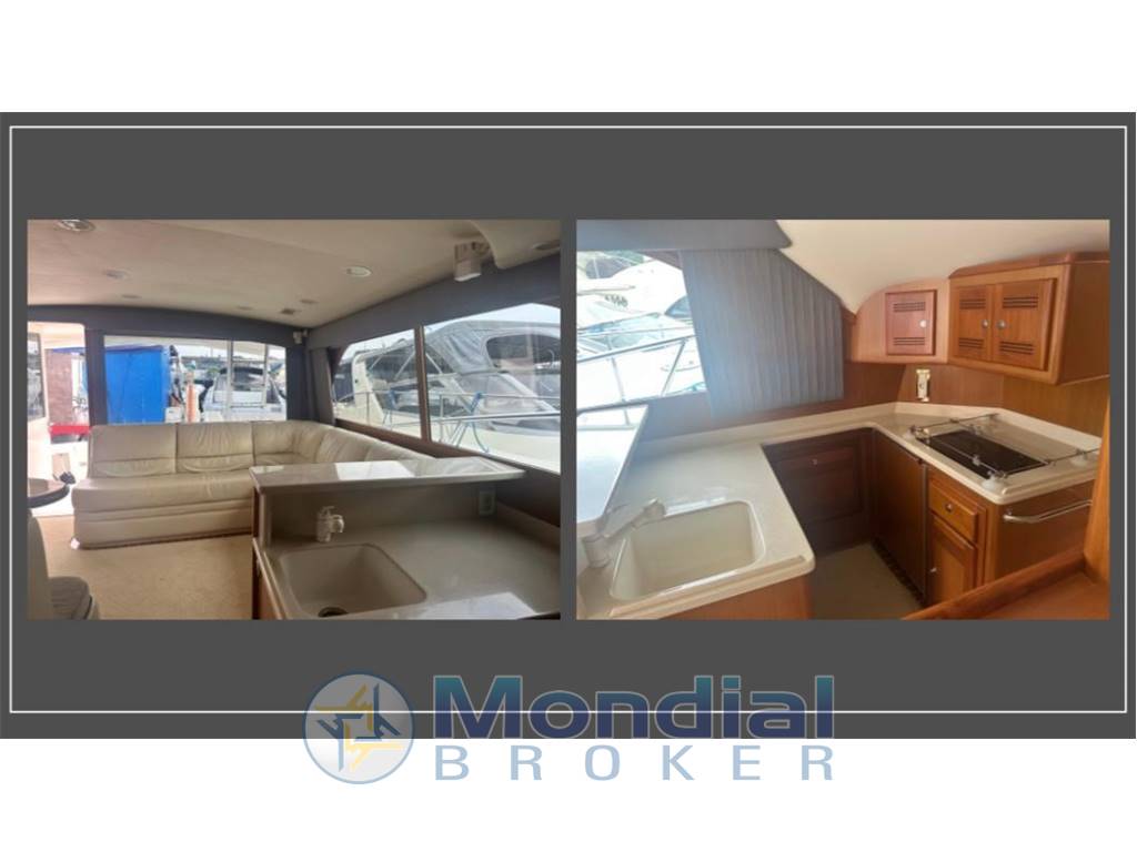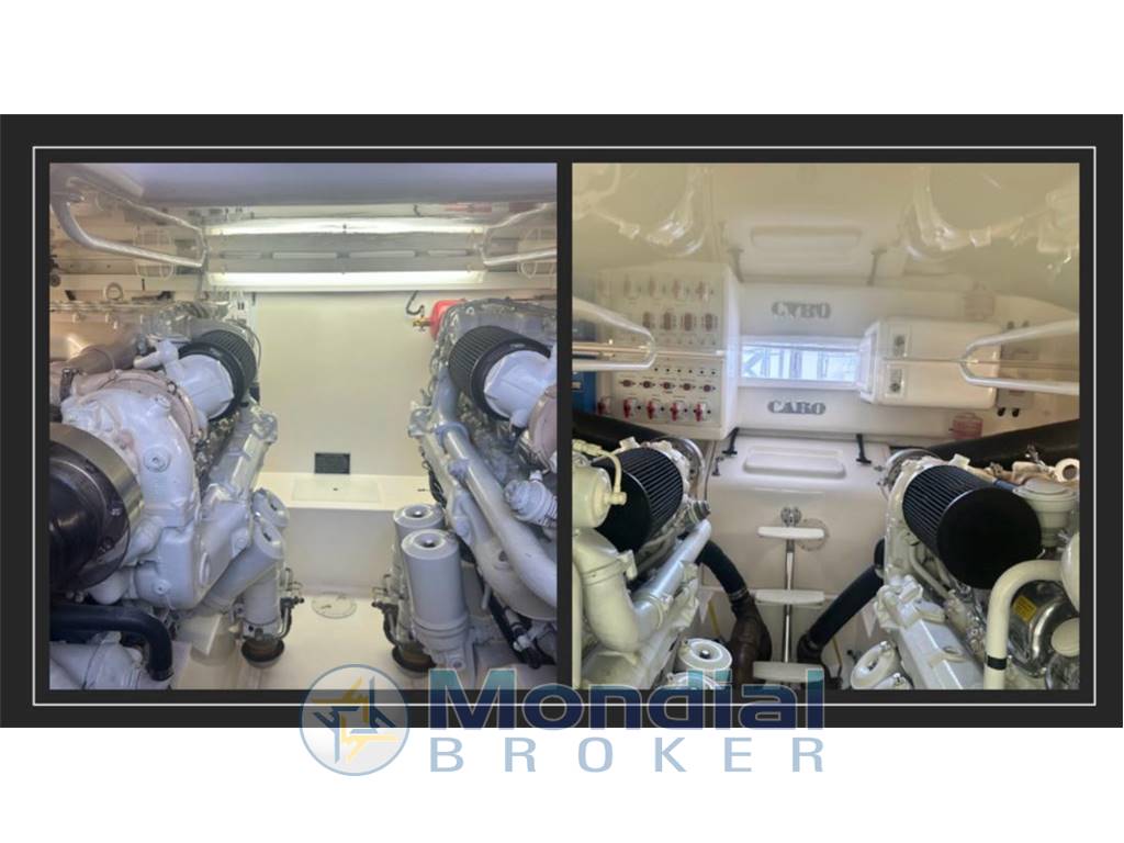 Manette di comando in pozzetto, elica di prua, autopilota Simrad, passerella idraulica, chiusura totale del fly in stratglass, stereo, vasca del vivo/pescato, divergenti. doppio motore per aria condizionata, lavatrice con asciugatrice