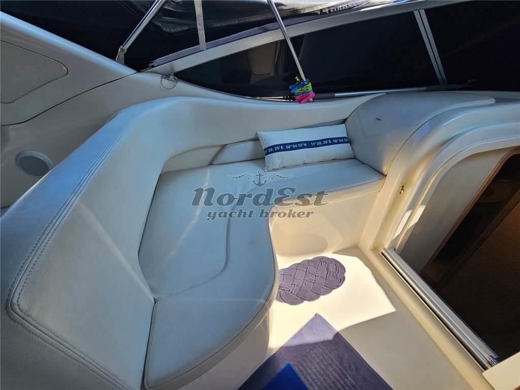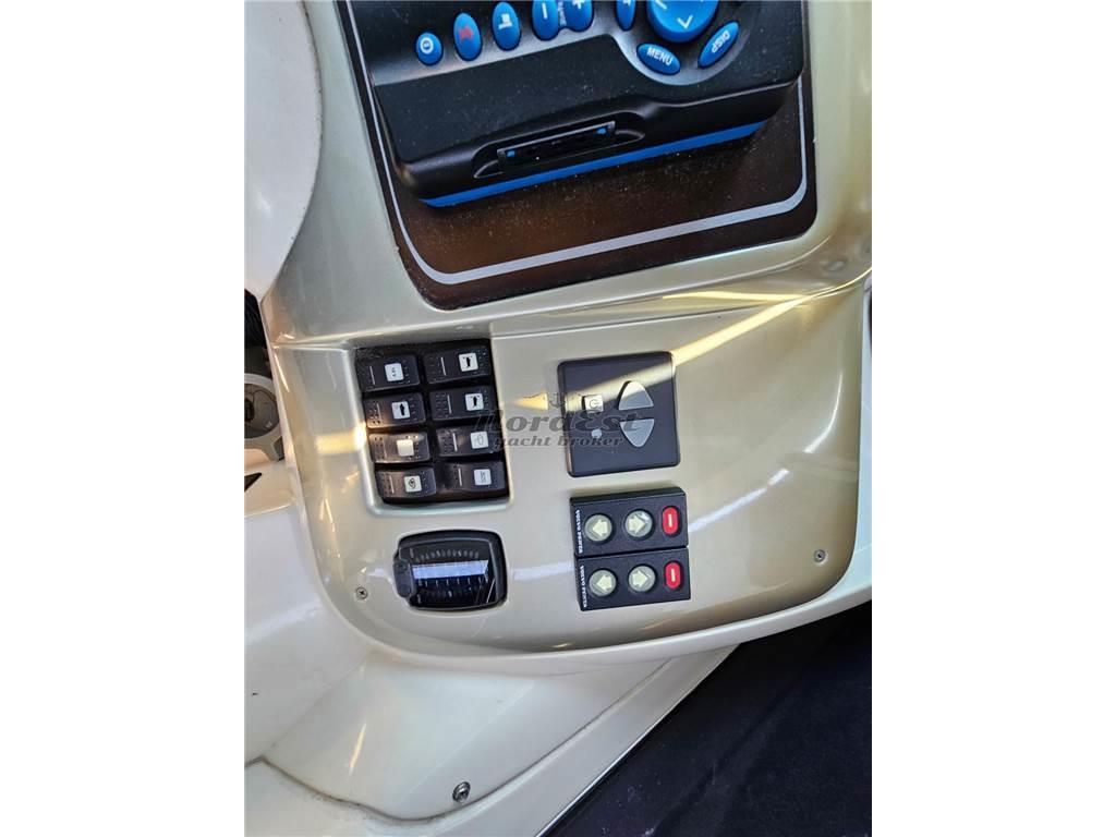 Questa versione dispone della cabina di prua separata rispetto alla zona giorno, caratteristica che la rende più comoda e riservata rispetto ad altri modelli simili. Lunga circa 11 metri, offre due cabine, un bagno, una cucina attrezzata e una spaziosa dinette interna. All’esterno si trova un’ampia zona living con prendisole a prua e a poppa. La strumentazione è completa, la cuscineria e i tendalini sono in buone condizioni.