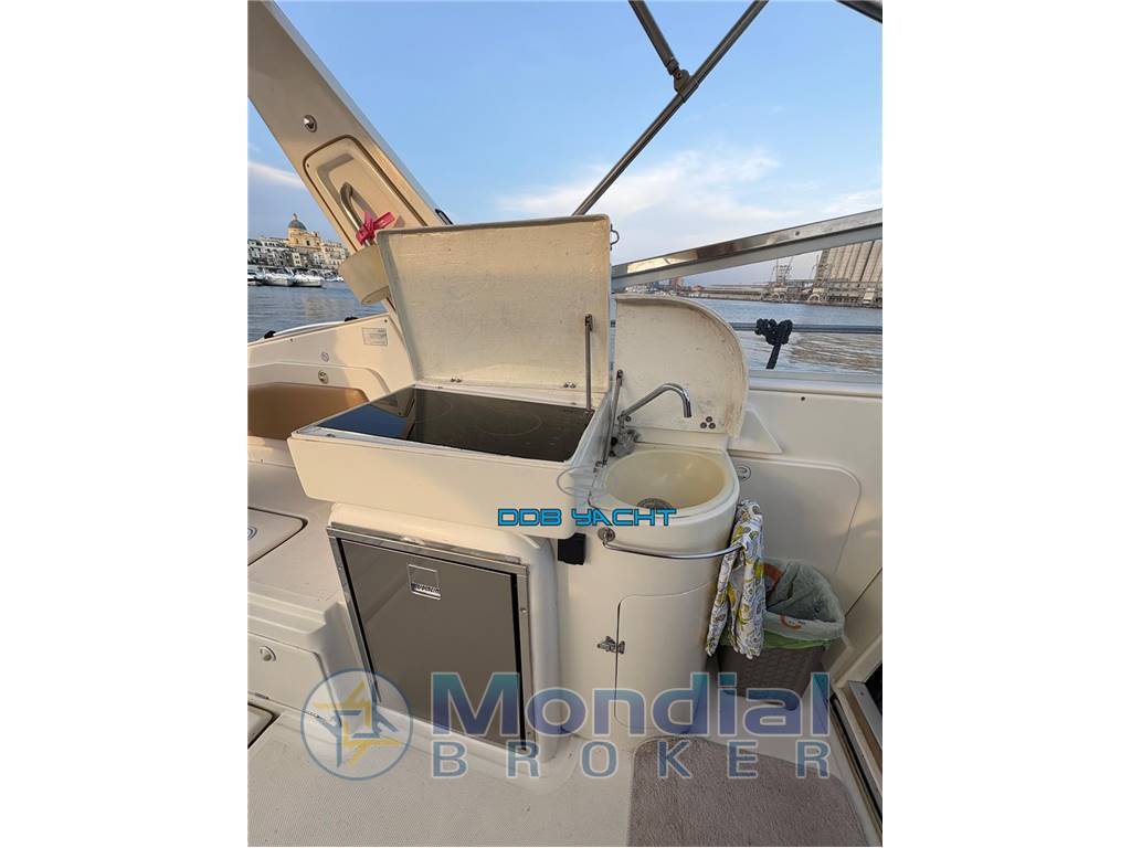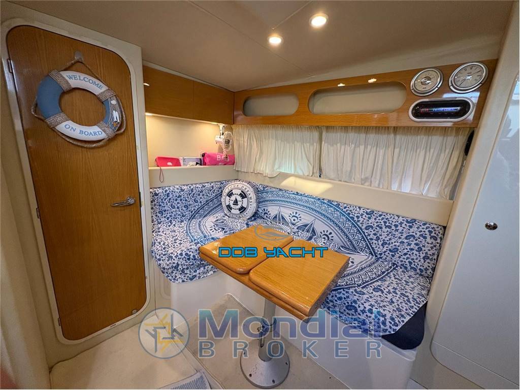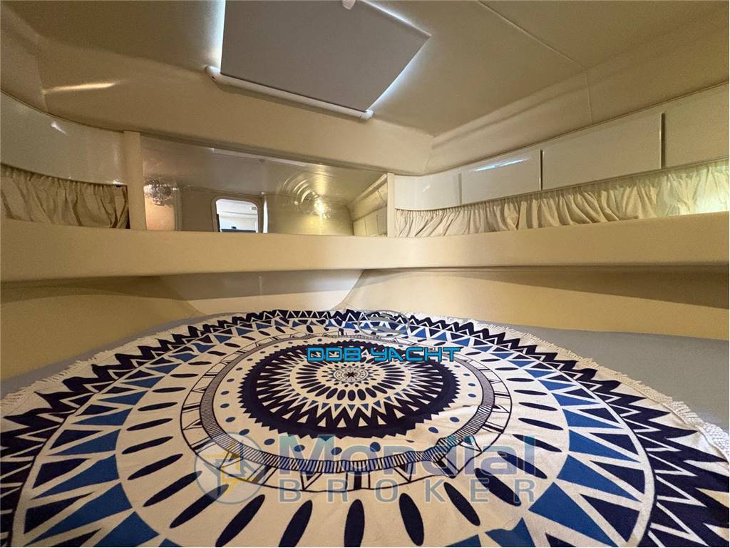 2 CABINE, 1 BAGNO: cabina armatoriale a prua, locale WC separato, dinette convertibile, cucina con lavabo, frigo ISOTHERM, piano cottura e mobili e pensili, cabina di poppa open space: ampio pozzetto di poppa con divani ad U con tavolo convertibile in prendisole, seduta pilota e co pilota in plancia di comando, ampio prendisole di prua.