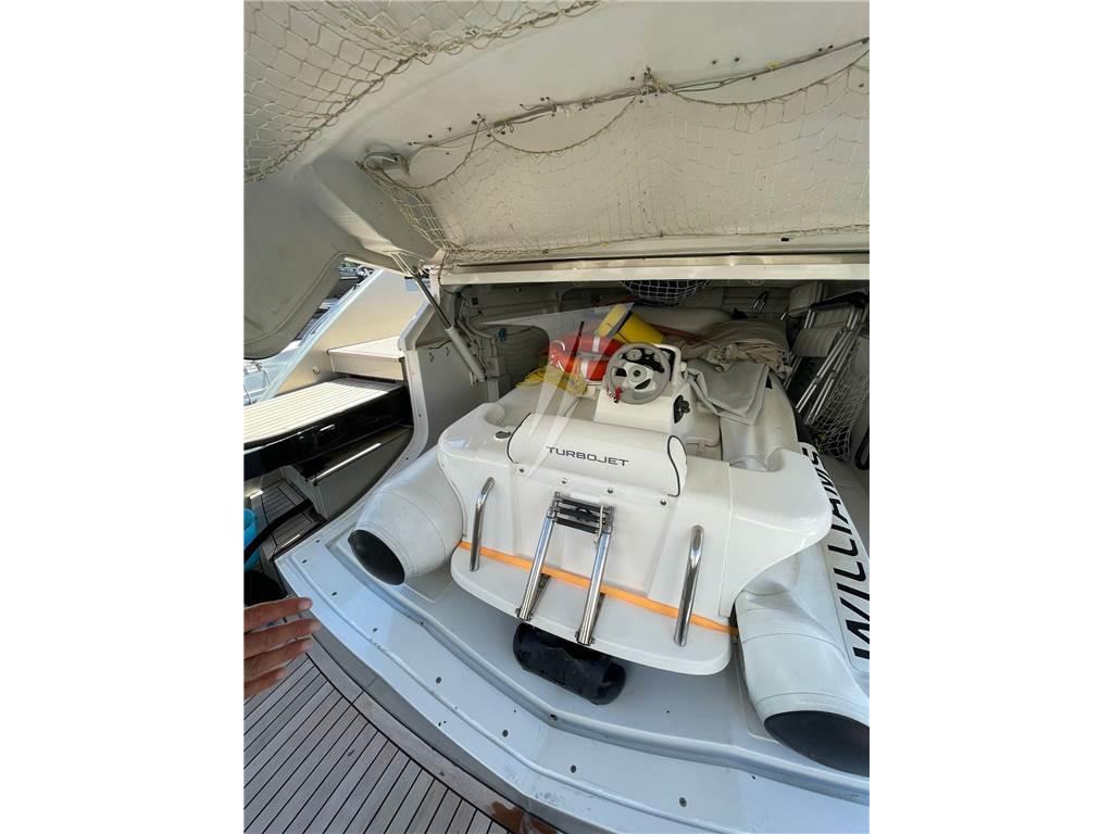 Ancora, Angolo barra, Antenna radar, Autoclave (doppia 24-220), Autogonfiabile, 12 Batterie (2021), 2 Bussola, Camminamenti laterali in teak, 2 Caricabatterie (1 Mastervolt +1 Victron Inverter 4,5 Kw/caricabatterie), Colorazione speciale, Comando motori elettronico, Contametri catena, Contamiglia, Doccia esterna, Ecoscandaglio, Elica di poppa - stern thruster, Elica di prua - bow thruster, Fari fissi a poppa (+ laterali), Faro orientabile, Flap idraulici, Garage per tender, GPS, Impianto antincendio, Indicatori Flaps, Lavaggio catena, Luci di cortesia, Luci subacquee, Passerella, Piattaforma, Pilota automatico, Plotter (Navionics 2020), Plotter con antenna GPS, Porta ingresso, Pozzetto Teak, 2 Presa 220V banchina, Presa acqua banchina, Radar, Raddrizzatore, Radio VHF, Salpa Ancore Elettrico, Scaletta da bagno (elettrica), Tavolo pozzetto, Tender (Williams 325 jet), Tromba, Winch Elettrico, 2 Winch tonneggio di poppa, Winch tonneggio di prua