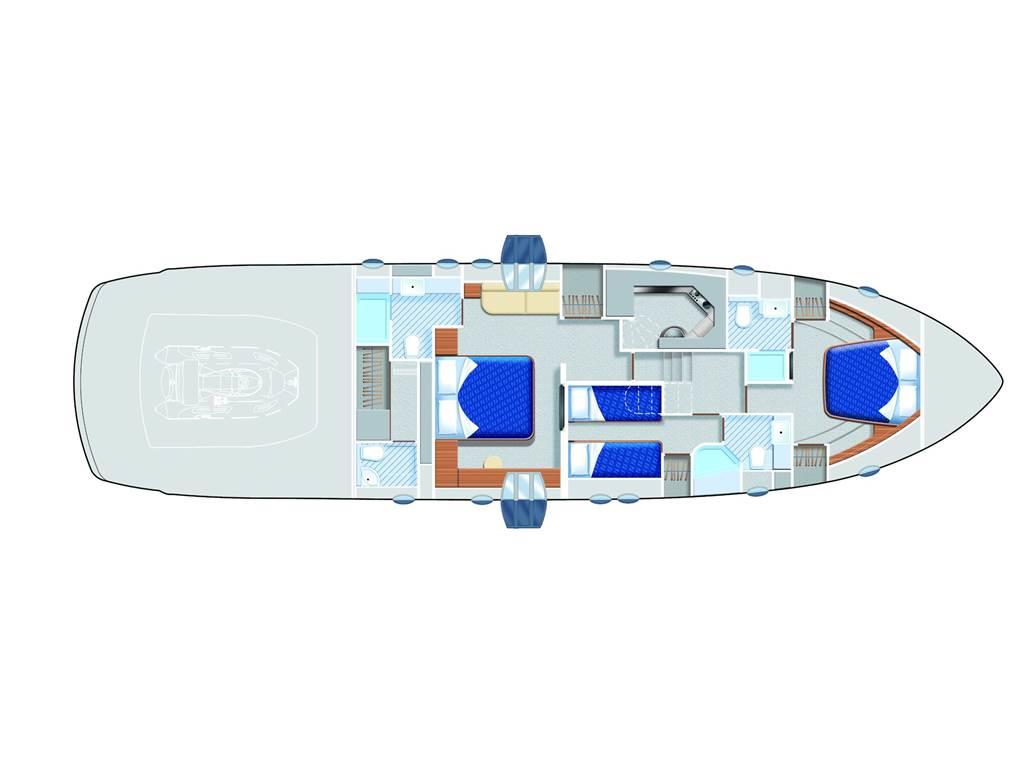 2 Matrimoniale italiana, 1 Doppia in piano, 1 Cabina equipaggio, 1 Toilette Equipaggio, 3 Toilette doccia no bidet