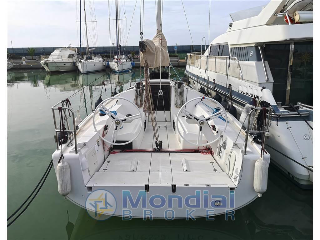Natante pronto all'uso con doppio timone a ruota e doppio gioco di vele bianche.