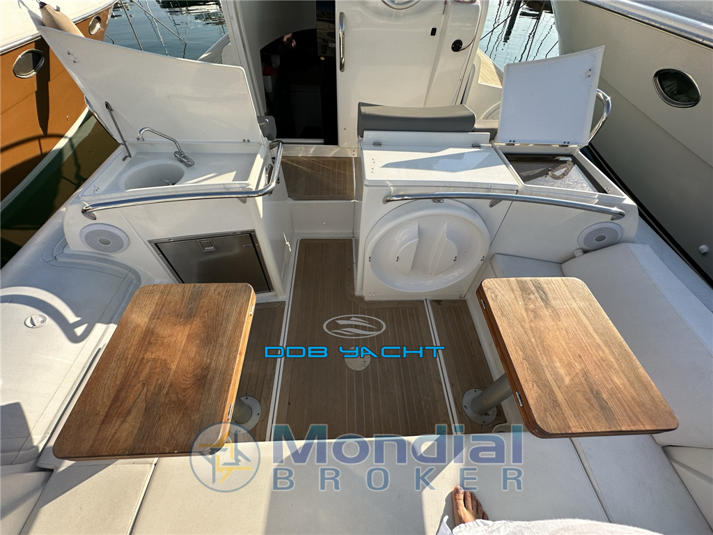 dotazioni di bordo e di sicurezza, tendalino parasole con candelieri in acciaio, pedana di poppa rivestita in TEAK, mobile pozzetto con lavello e frigo a pozzetto, pozzetto in TEAK.