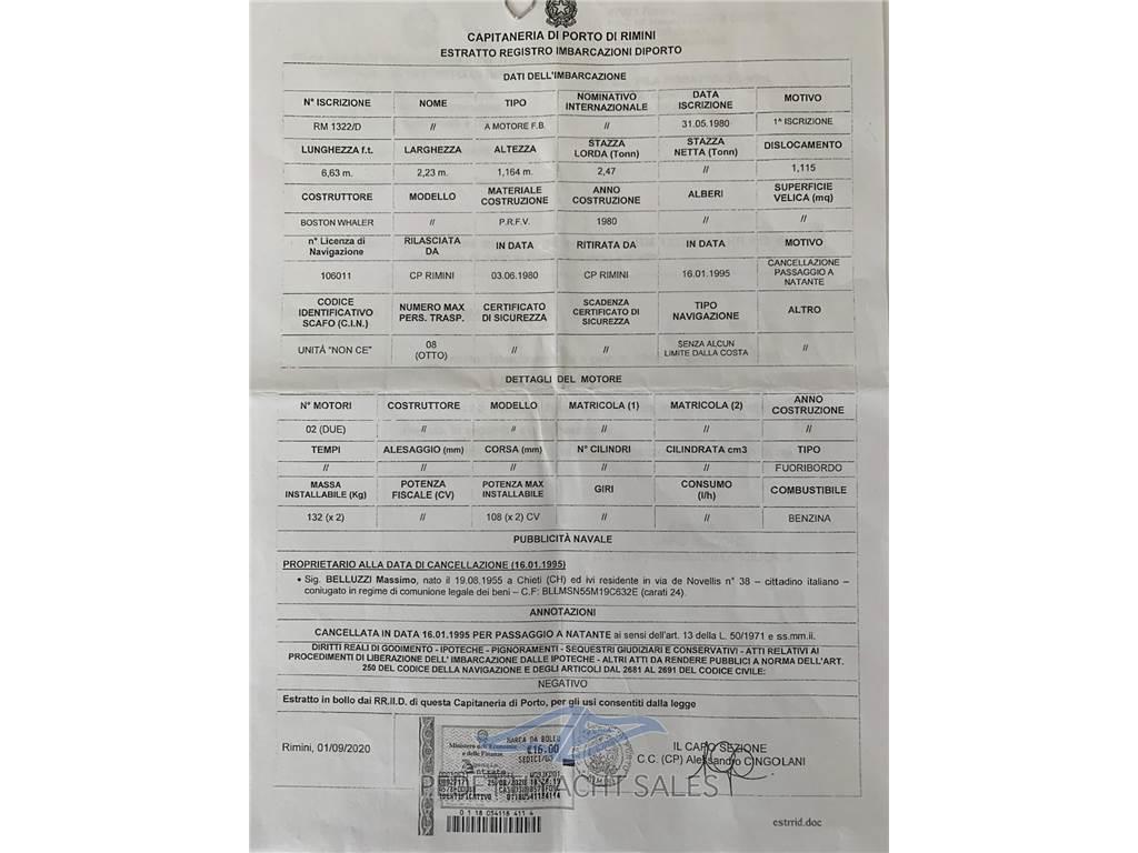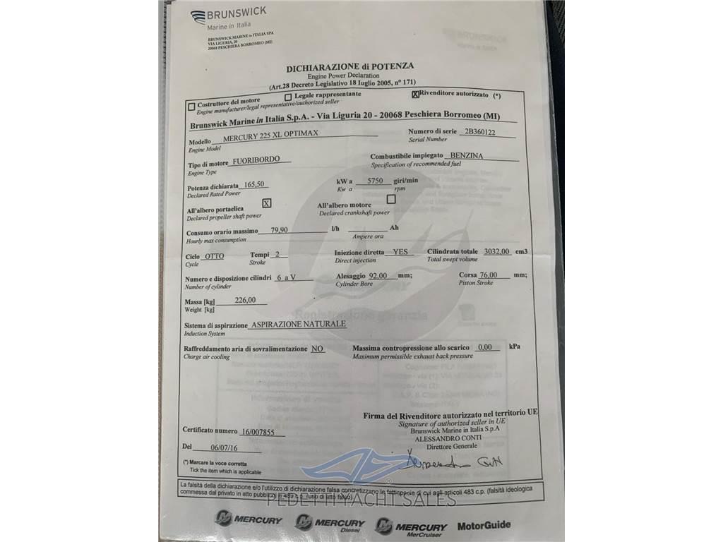 Allarme motore, Alternatore, Ancora, Autoclave, Bussola, Caricabatterie, Cavo corrente di banchina, Contamiglia, Doccia esterna, Ecoscandaglio, GPS, Log, Luci di navigazione, Parabordi, Piattaforma, Plotter con antenna GPS, Pompa di sentina automatica, Pompa di sentina manuale, Presa 220V banchina, Quadro comandi, Radio VHF, Salpa Ancore Elettrico, Sedile Copilota
