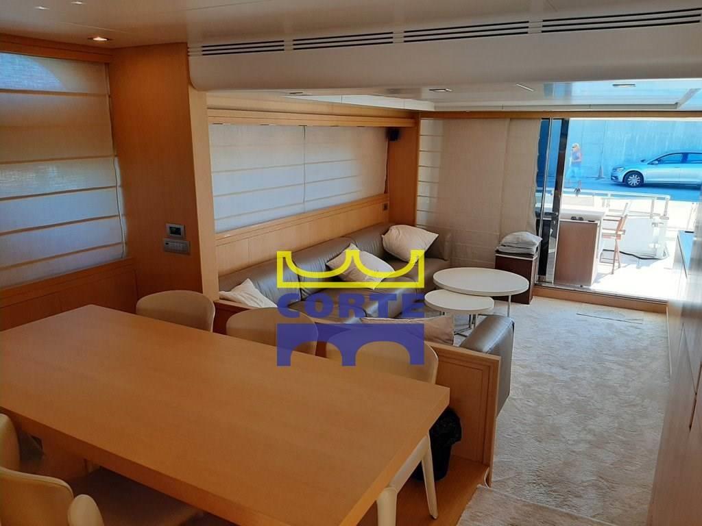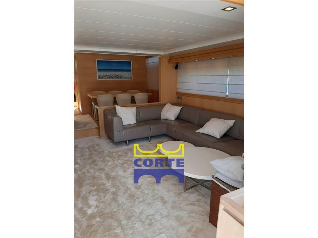 Salone con divano a L, mobili contenitori , Zona pranzo con tavolo e sedie , Cucina separata con mobili laccati bianchi, attrrezzata con lavastoviglie, forno e frigo, Cabina armatoriale matrimoniale con bagno, Cabina VIP matrimoniale con bagno, Cabina ospiti doppia con letti in piano + letto pulmann e bagno, Cabina singola con bagno .