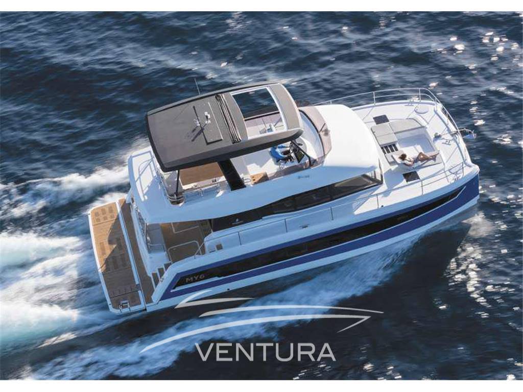 The MY 6 expresses the quintessence of Fountaine Pajot Motor Yachts' promise: to expand its horizons. The designer, PierAngelo Andreani, has created extraordinary volumes for the MY6, equivalent to those offered by a 20 meter monohull. The living space on board, similar to a second home, is breathtaking: its huge flybridge offers a superb view of the horizon line, its lounge, a real loft with terrace, has a large living room and a kitchen which opens onto the cockpit.