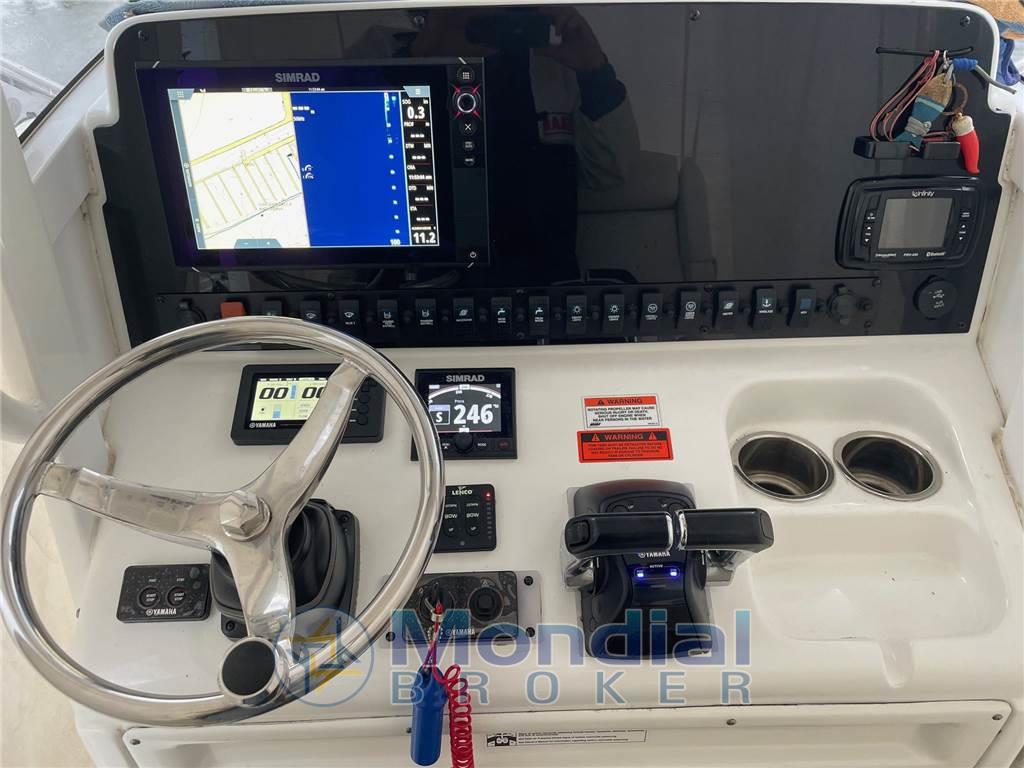 manette elettroniche; sempre rimessata a secco da novembre a giugno; T-Top; Sistema acqua nebulizzata T TOP ; 2 prese 12 V per mulinelli elettrici; Luci pozzetto; 4 faretti notturni T Top; Proiettori luce 1 prua e 2 poppa T Top ; 2 faretti immersione specchio di poppa; sonda ecoscandaglio 600 w.; 10 portacanne riposo; trattamento preventivo antiosmosi; 2020 NUOVO : motori fuoribordo; mediazione del 5% +IVA 22% a carico dell' acquirente (IVA si calcola sull' importo della mediazione) .