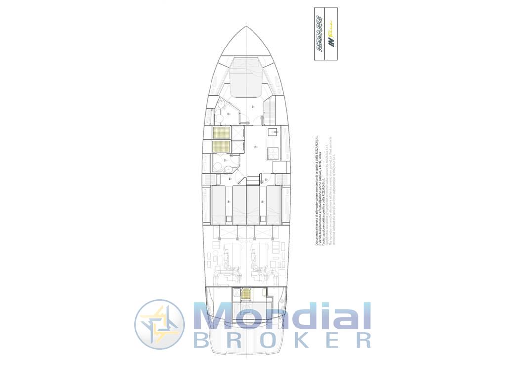 1 Matrimoniale italiana, 2 Doppia in piano, 1 Cabina equipaggio, 2 Toilette con doccia, 1 Cucina, 1 Toilette Equipaggio