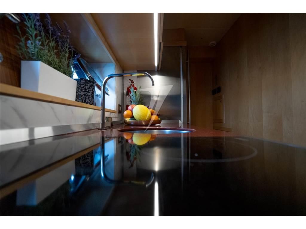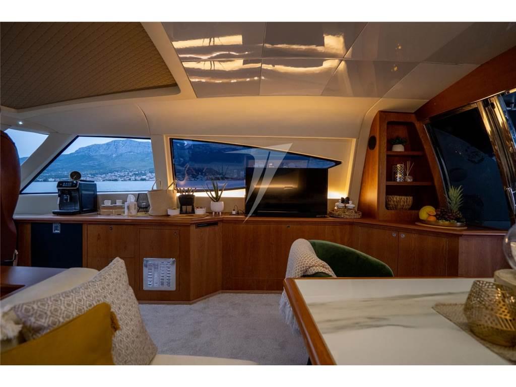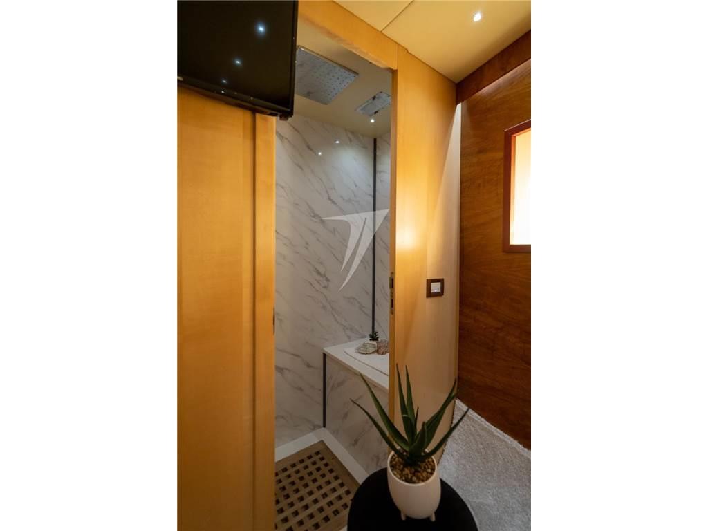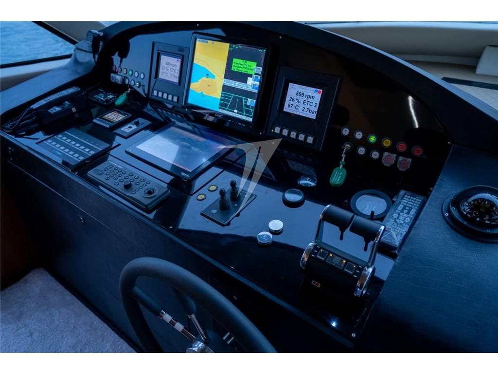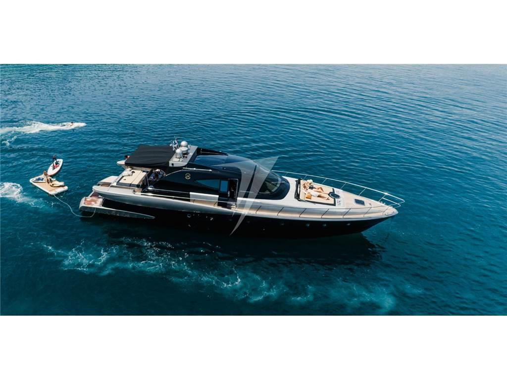 Questo modello offre spazi ben distribuiti e grande vivibilità sia all’interno che all’esterno. La carena in vetroresina con trasmissione in linea d’asse è motorizzata con due MTU 10V2000 M93 per una potenza complessiva di 3004 HP, permettendo di raggiungere una velocità massima indicativa di circa 40 nodi. L’unità è certificata RINA e IVA assolta.