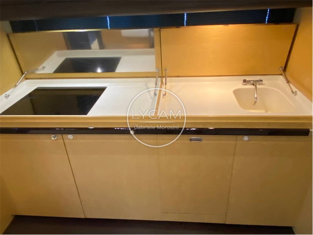 Sottocoperta: dinette con cucina attrezzata con frigorifero, freezer, lavastoviglie, zona pranzo, a mezzanave cabina armatoriale con bagno en suite; a prua cabina VIP con bagno en suite; cabina ospiti 2 letti singoli con bagno notte/giorno; cabina marinaio con bagno.