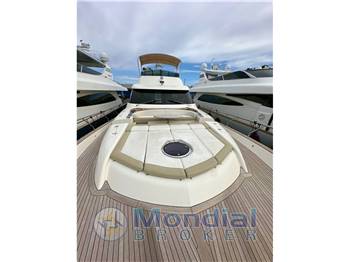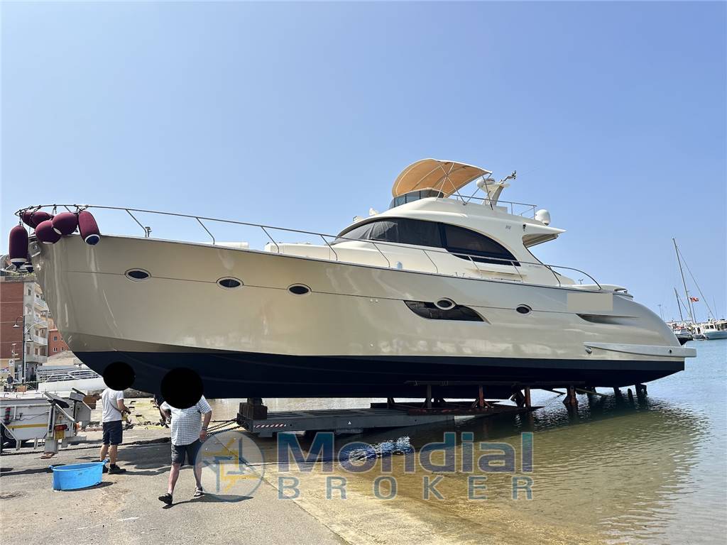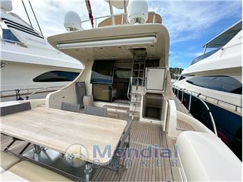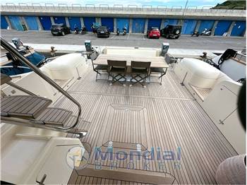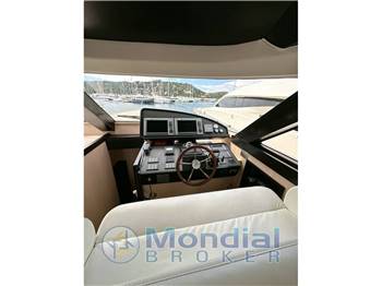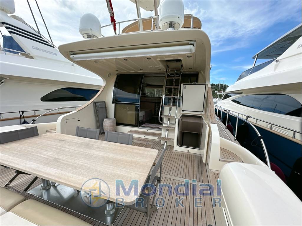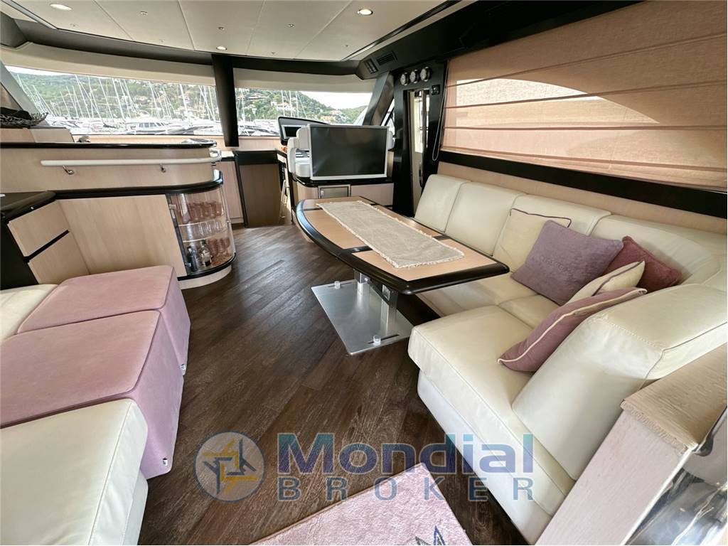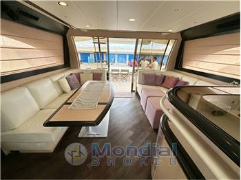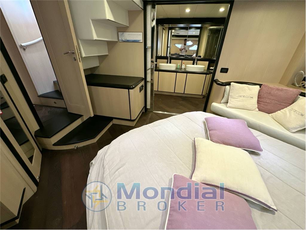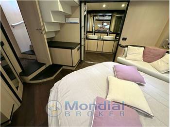 Layout interno composto da cabina armatore a centro barca con letto matrimoniale e toilette privata suddivisa in due locali; cucina accessoriata al piano del salone, locale con cantina vini e acquaio e labvatrice. Cabina ospiti con letti singoli affiancati, cabina VIP a prua con toilette privata e box doccia. Flybridge con postazione di comando e prendisole. Ampio prendisole prua con divano e sedute e tendalino. Pozzetto comodo con tavolo, piattaforma bagno, garage tender. Cabina equipaggio (2) a poppa con ingresso dal pozzetto.