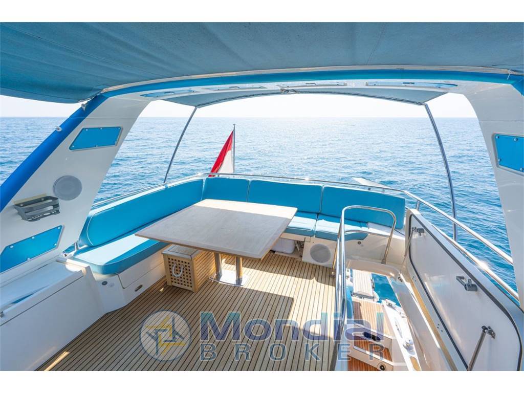 The flybridge serves as a social hub with lounges, sunpads, and a helm station, while the hydraulic swim platform ensures safe and easy access to the water.