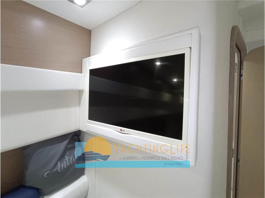 Altoparlanti, Antenna Satellitare TV, Aria condizionata, Boiler, Cucina, Cuscineria completa, 2 Frigorifero interno, Impianto TV, Pavimento interno in legno, Piastra in vetroceramica, Prese interne 12v, Prese interne 220v, Riscaldamento, Stereo, Tendalino, 2 TV (interna ed esterna), WC marino elettrico, Zattera di salvataggio