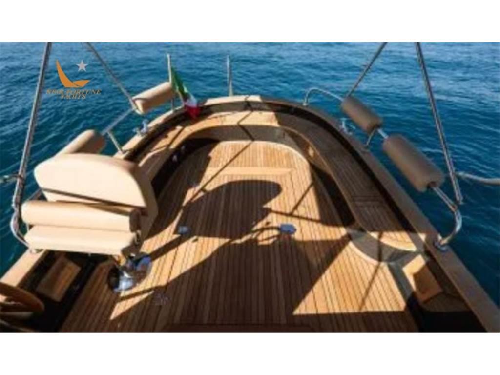 , Dotazioni standard: Fascione e capodibanda in mogano, pulpito Aisi 316, prese d’aria, bitte e passacavi con piastre di protezione fasciame, passo uomo, n°4 cuccette, divanetto poppa, imbarco per acqua e gasolio, musone in acciaio, flap + indicatore flap, pala di timone in acciaio e barra in legno, chiusure per tutti i portelli, vano motore insonorizzato, bandiera, presa ABS per cellulare, n°4 luci a led in cabina di prua e nel vano motore, differenziali magnetotermici, interruttori per tutti i servizi, staccabatteria, indicatore gasolio, voltometro, contagiri, pressione olio, pressione acqua, spie con allarmi.