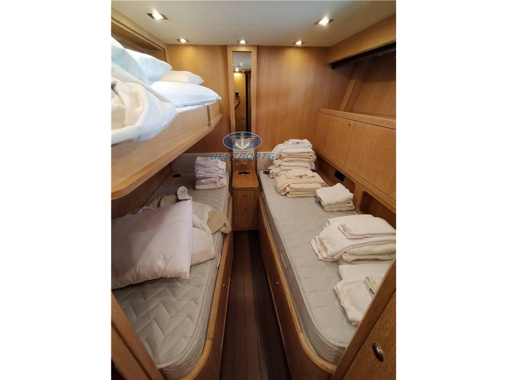 Cabina armatoriale con letto matrimoniale e bagno – cabina ospiti con letto matrimoniale e bagno – cabina ospiti con due letti in piano, terzo letto a scomparsa e bagno. Alloggio equipaggio doppio con servizi.