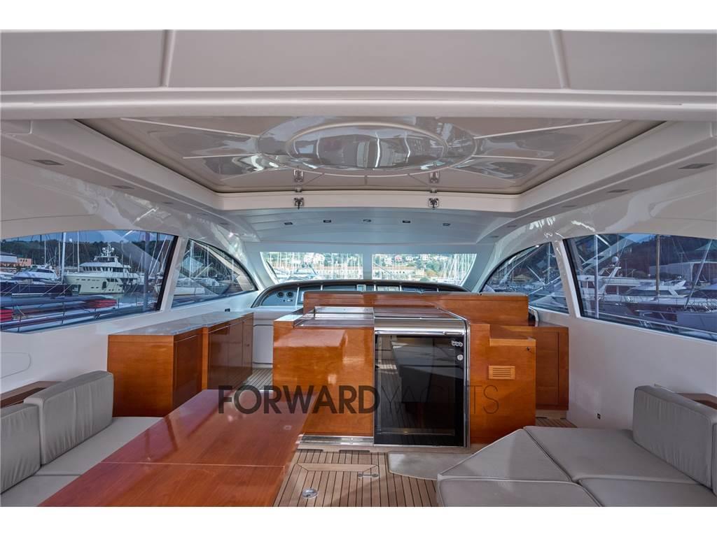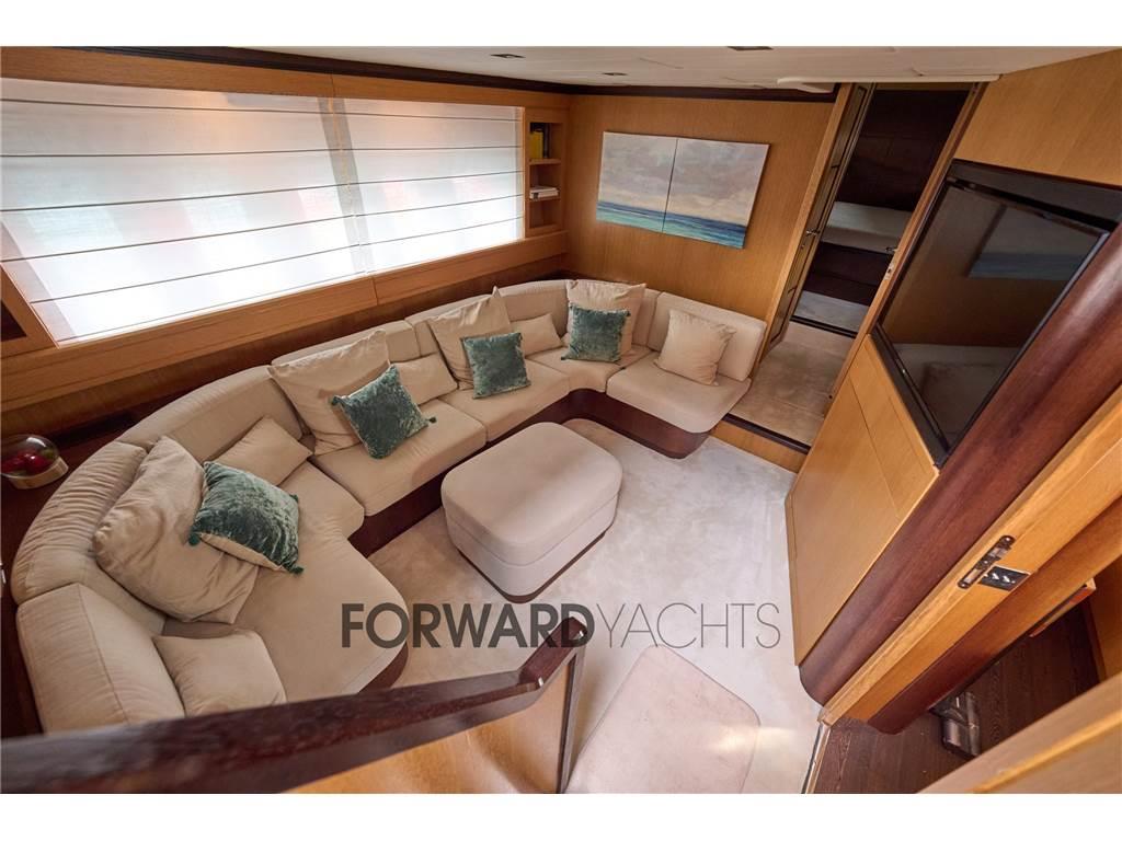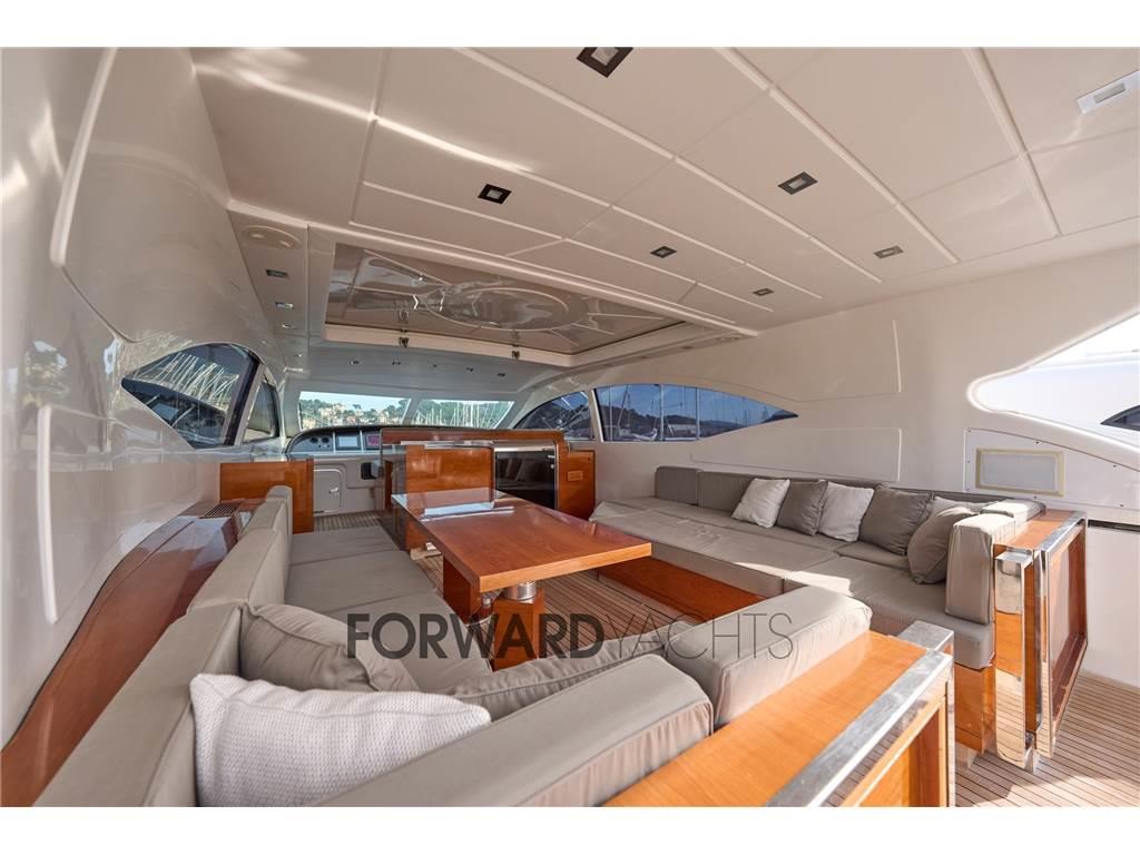 Il salone sul ponte principale, ampio e arioso, è arredato con due divani a L, tavolo da pranzo, mobile bar e un sistema di intrattenimento completo, inoltre troviamo anche la plancia di comando. Il grande hard top apribile e le finestrature laterali inondano di luce naturale lo spazio, creando una continuità armoniosa