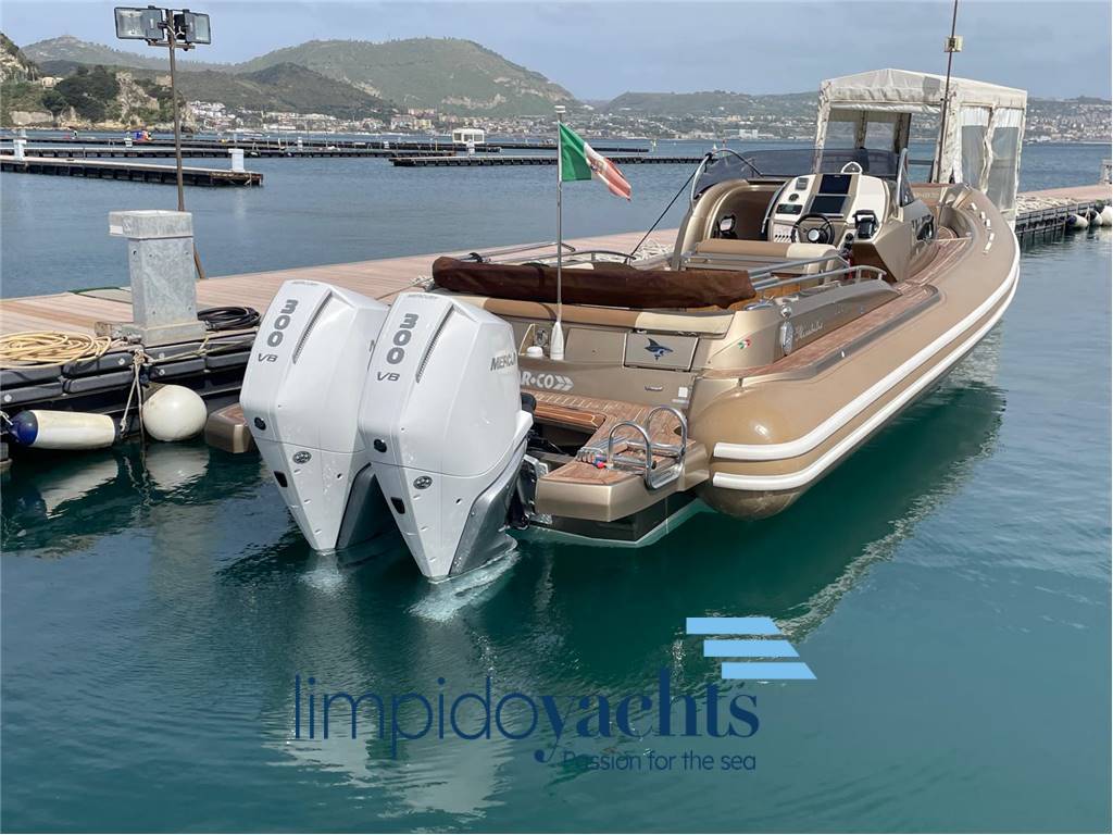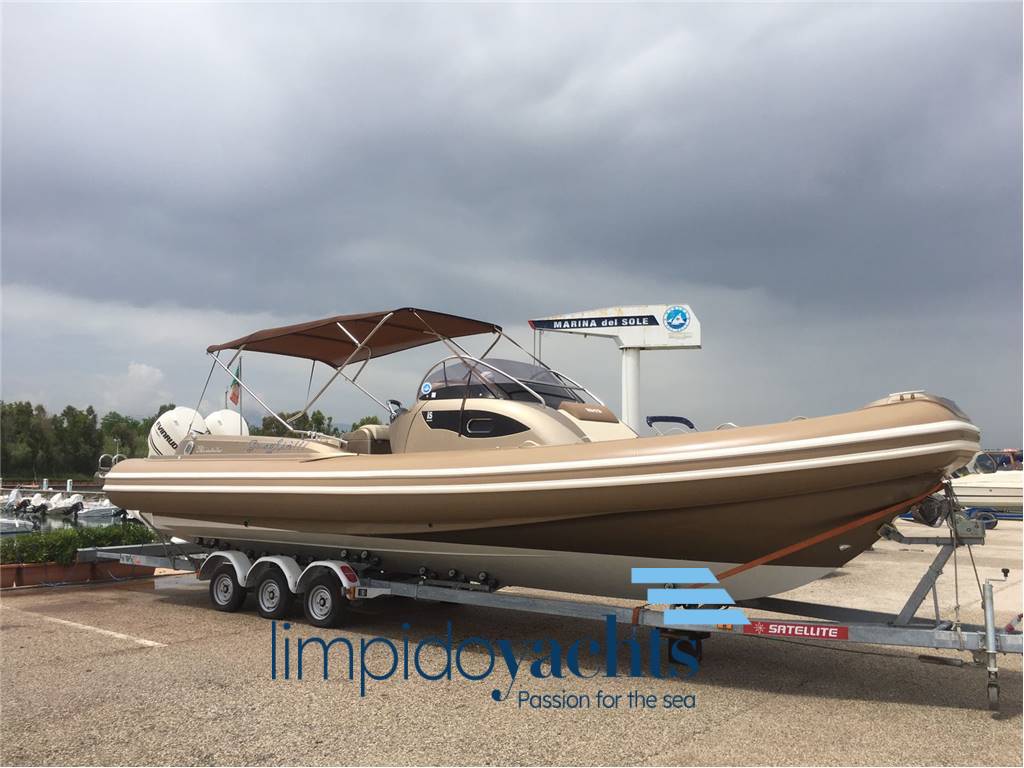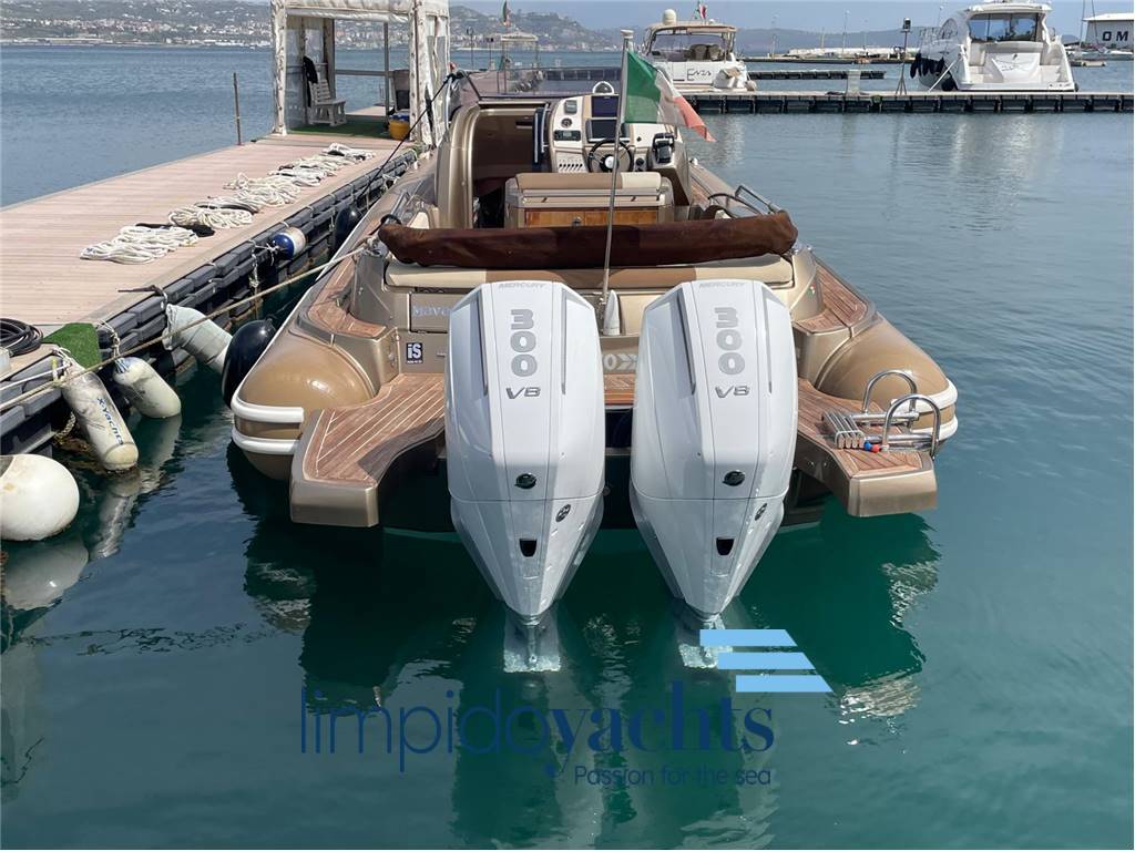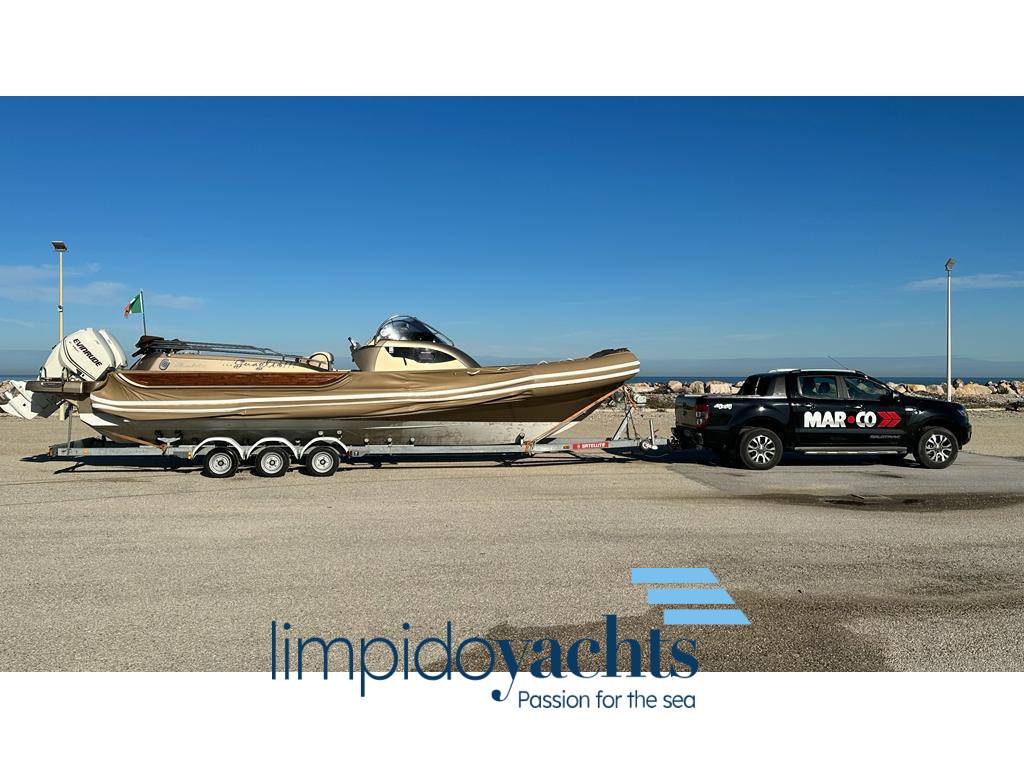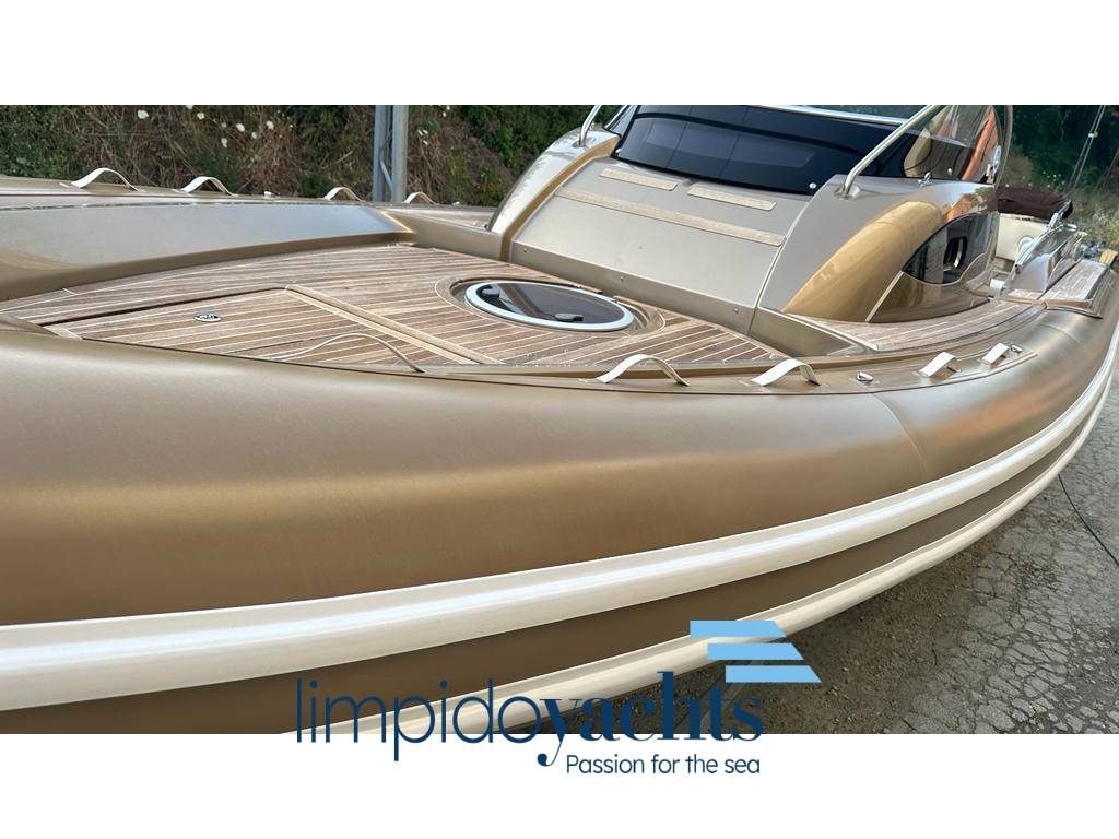 Altre dotazioni del gommone: Impianto audio Fusion con doppia interfaccia (interna e esterna) + 4 casse esterne e 2 interno cabina, serbatoio carburante L 750 installato a norme CE, Doccia di poppa con autoclave e serbatoio L 130, Frigorifero a pozzetto, Lavandino e rubinetto esterno in panca pilota, Pannello comandi in console, Pompa di sentina automatica, Arredamento completo cabina, toilette con lavandino e wc elettrico, Supporto elettrico per tavolo dinette, Contametri in plancia per verricello di prua, Caricabatteria con presa in acciaio inox e cavo banchina, Rivestimento completo in Teck
