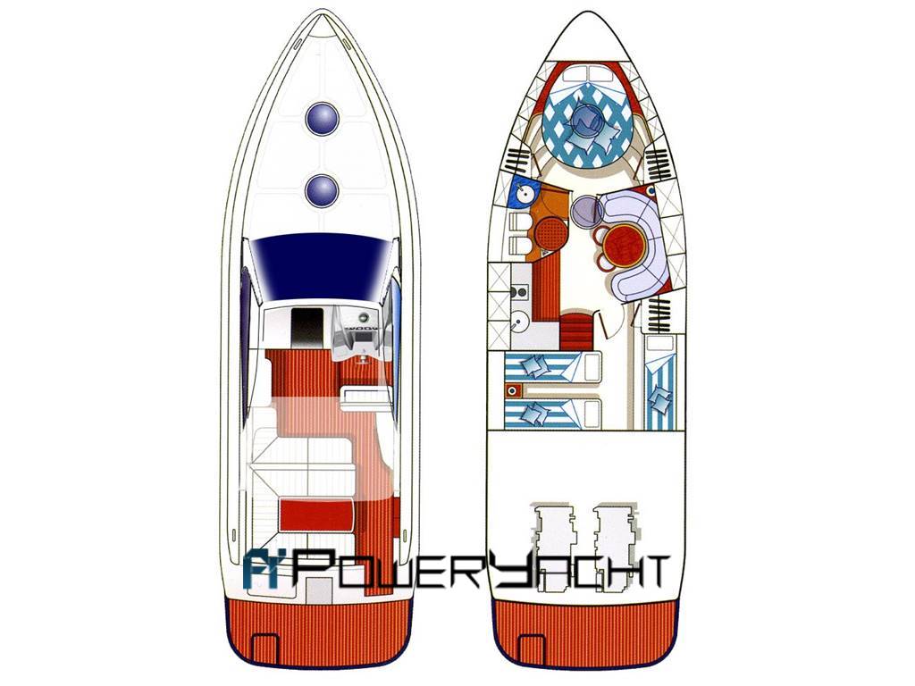 Cabina armatore a prua, cabina a centro barca con tre posti letto. Bagno con doccia a sinistra. Cucina a L. Dinette a C, trasformabile in letto doppio.