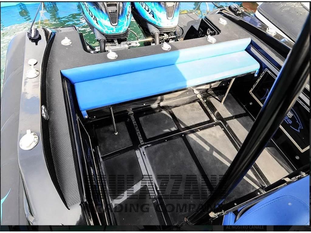 Altoparlanti, Bimini (in acciaio completo di luce led per la navigazione), Cassetta di pronto soccorso, Cinture di salvataggio, Cuscineria completa, Cuscineria di poppa, Cuscineria di prua, Dotazioni di sicurezza entro 12 miglia, Giubbetti di salvataggio, Salvagente anulare con cima munita di boetta luminosa, Stereo, Tendalino