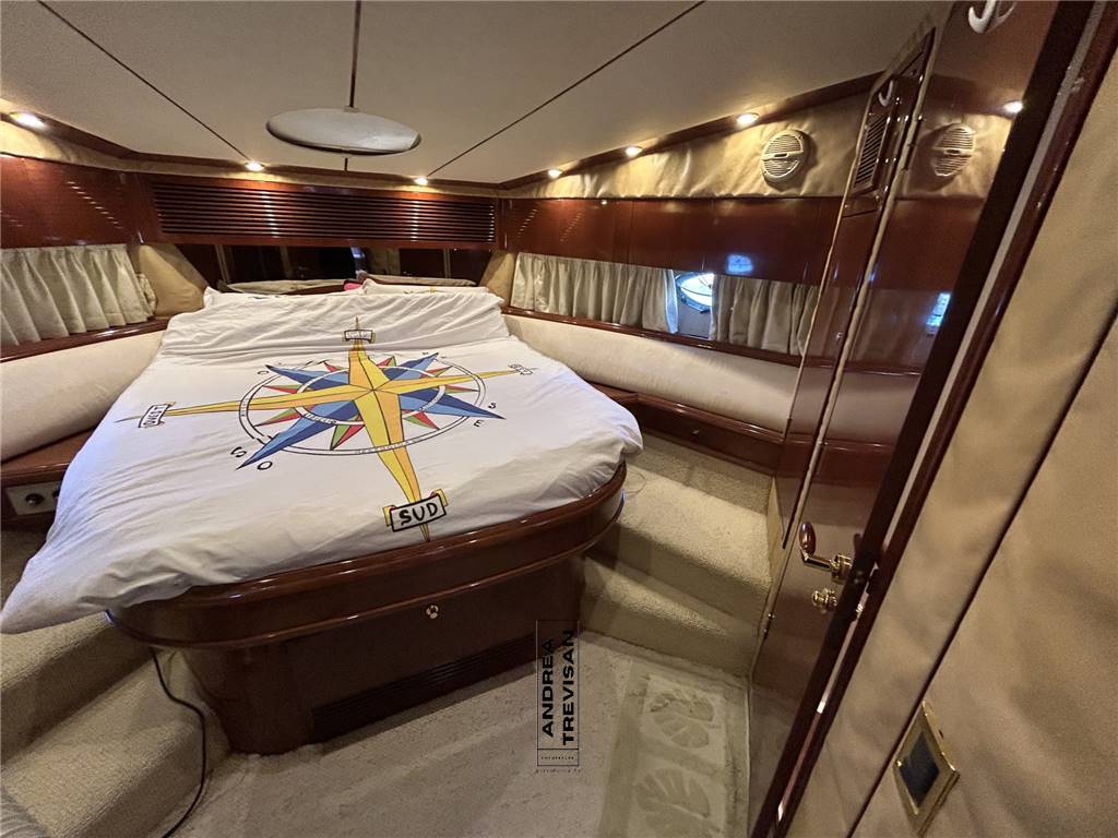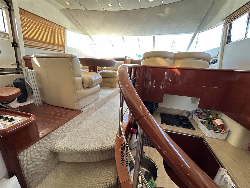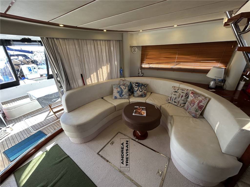Grande dinette con divano circolare e tavolo da caffe. Mobile bar con Tv. Tre gradini portano alla cucina completamente attrezzata e alla zona cambusa dov'è presente un ulteriore grande frigo e lavasciuga oltre a secondo accesso alla sala macchine. Verso prua tavolo da pranzo con divano circolare e sul lato di dritta postazione di guida interna. Scendendo la scalinata si accede alla zona cabine con armatoriale a prua con bagno esclusivo e alle due doppie con letti gemelli in piano con bagno. A poppa la cabina marinaio attualmente utilizzata come ripostiglio.