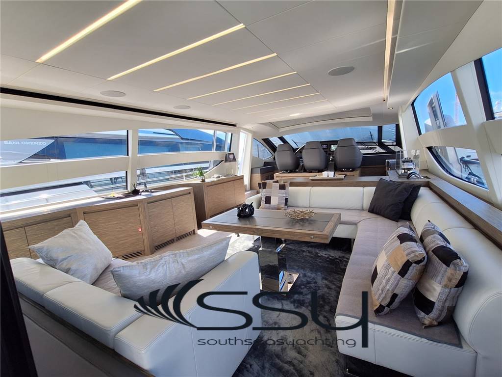 - a seguire troviamo un mobile aggiuntivo completo di altro frigobar e stivaggio e la plancia comandi con 3 sedili Poltrona Frau con regolazione elettrica Besenzoni e le due porte laterali elettriche.