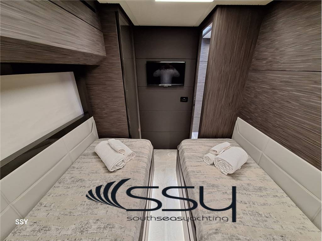 - 2 cabine ospiti doppie gemelle con letti in piano, smart TV Samsung + sat receiver + Fusion MSAV600 + Gigaset cordless ed un bagno in comune con box doccia con mosaico Bisazza.