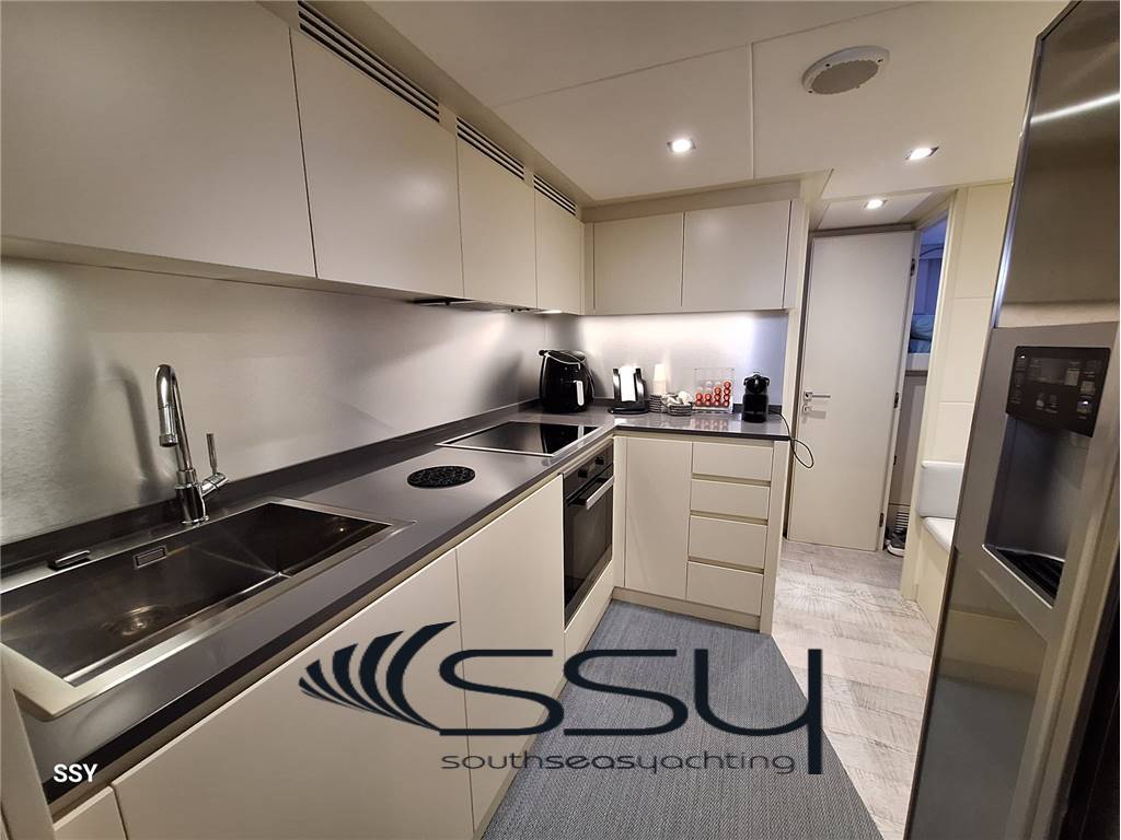 - Verso poppa e con ingresso dedicato troviamo la zona equipaggio con accesso alla cucina diretto alla cucina con piano cottura ad induzione, forno elettrico + microonde, frigorifero e freezer con icemaker, lavastoviglie e lavasciuga Hoover (6+5kg);