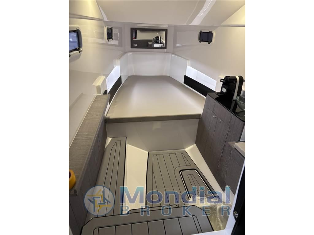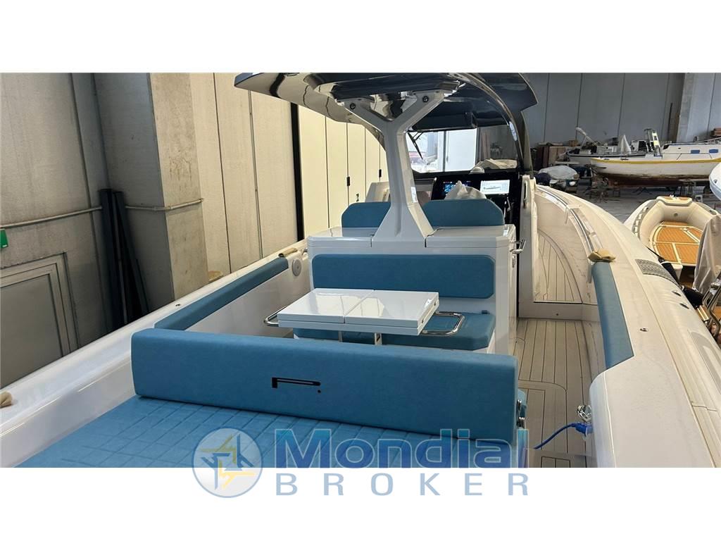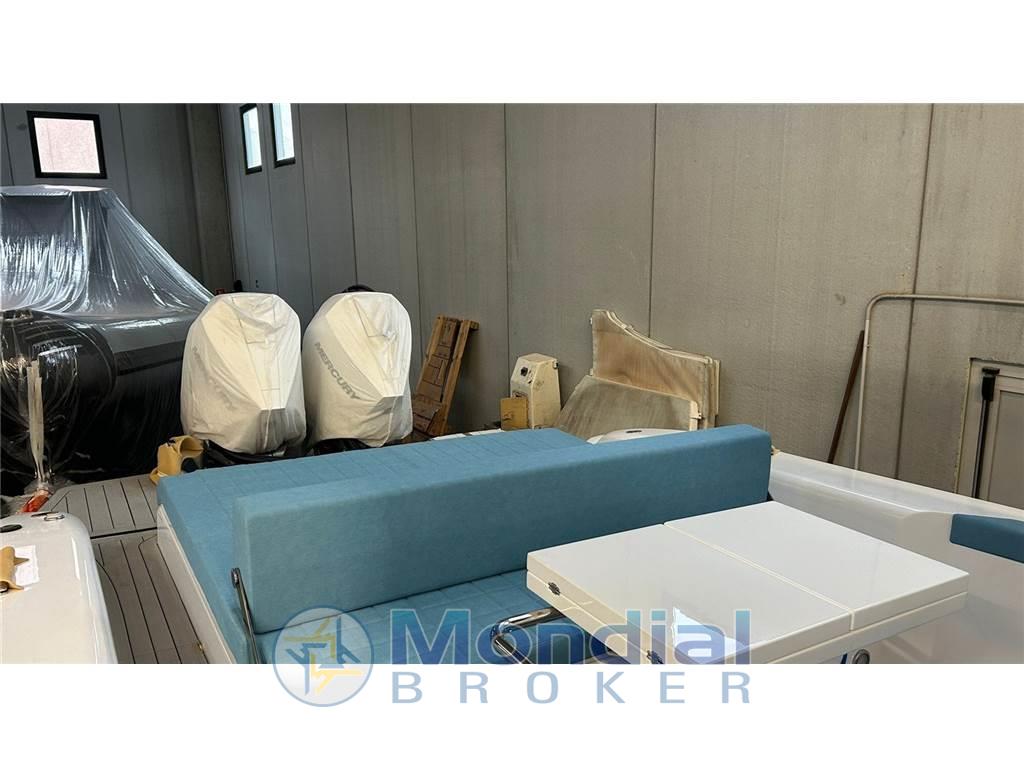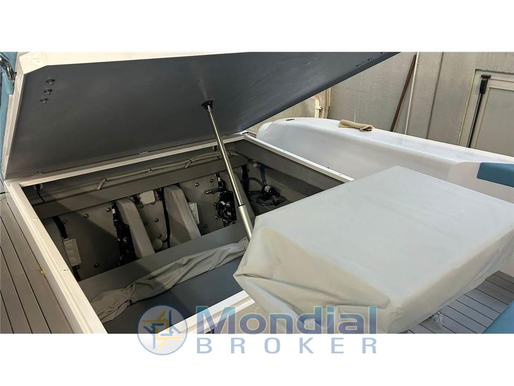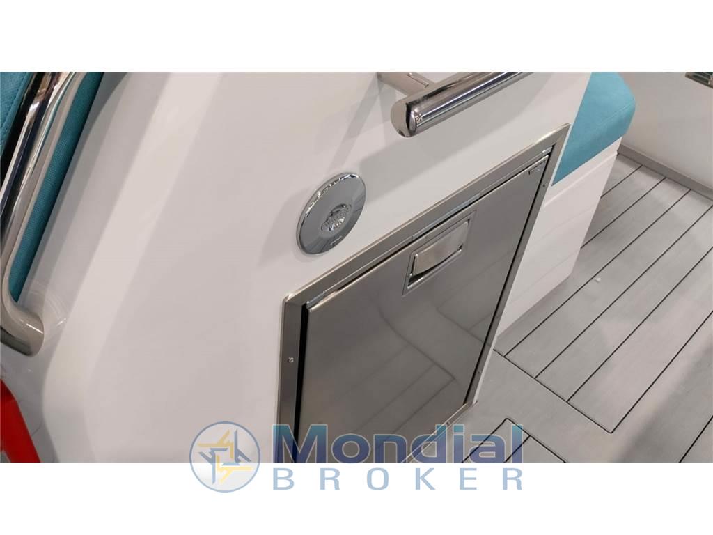 Lavandino e zona wet bar esterni, Cuscineria completa (prua, pozzetto), Tavolo esterno rimovibile, Sistema acque nere con pompa maceratrice, Carena a doppio step, Frigo a cassetto, Hard‑top integrato con vetri / parabrezza, Piattaforma bagno con Scaletta bagno retrattile in acciaio inox, Oblo apribili laterali, tendalino ombreggiante di poppa con pali in carbonio