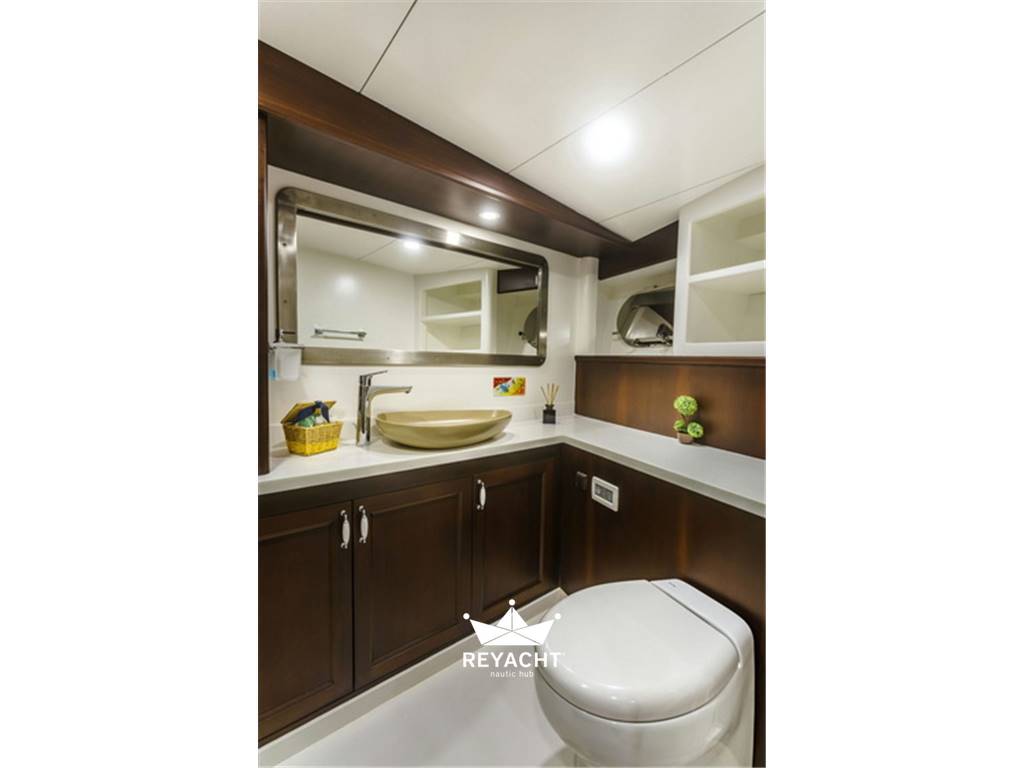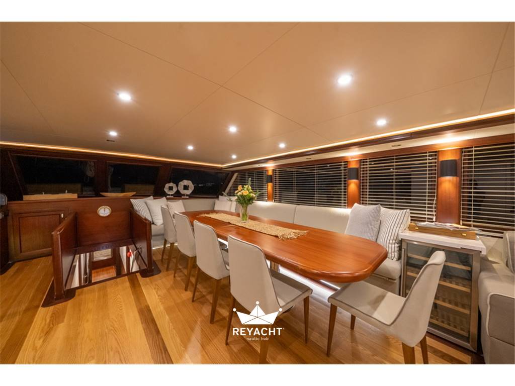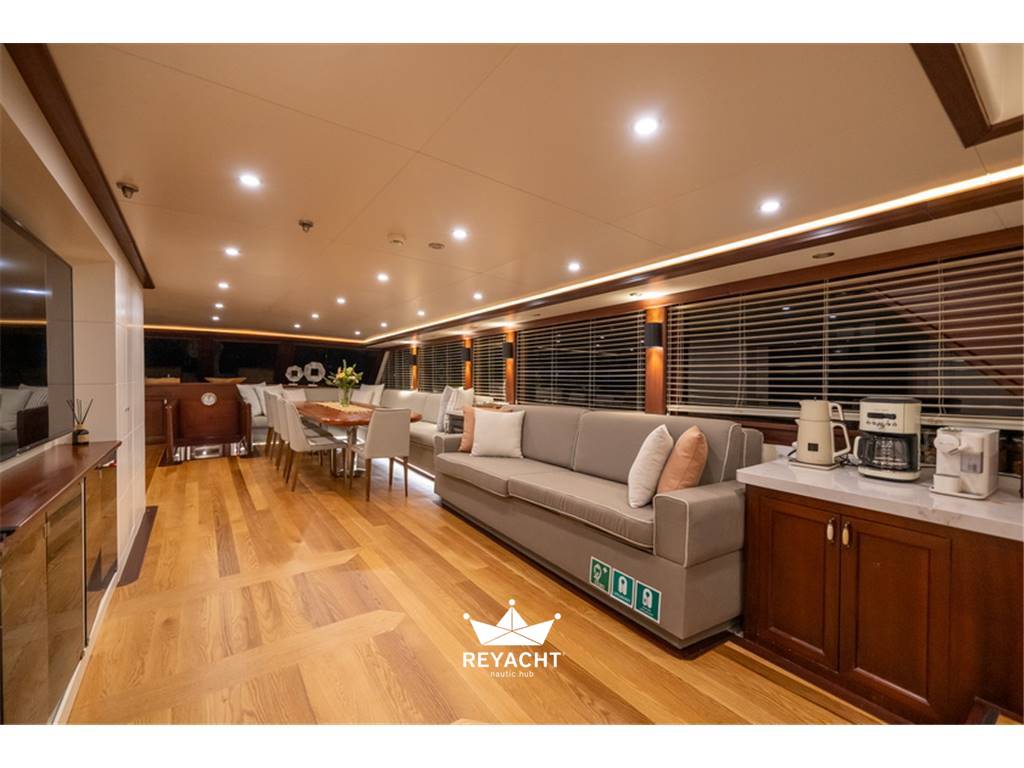 Les ponts spacieux en teck, le cockpit convivial et le vaste flybridge invitent à la détente et à la vie extérieure. L’intérieur accueille 12 invités dans 6 cabines luxueuses, dont une grande suite armateur arrière, trois cabines doubles et une cabine twin, toutes avec salle de bain privative. Les boiseries nobles, la luminosité et les volumes généreux créent une atmosphère chaleureuse et raffinée.
