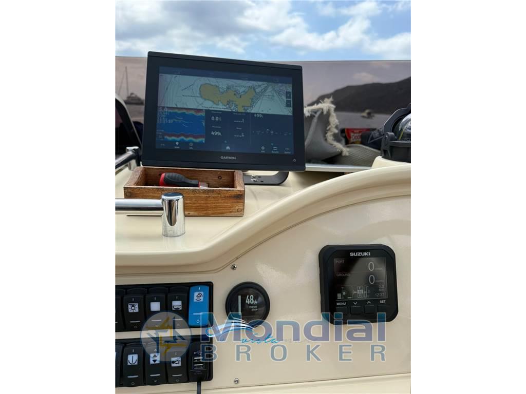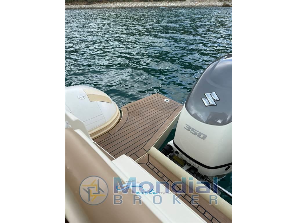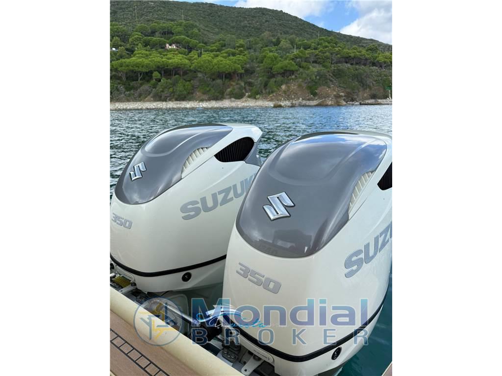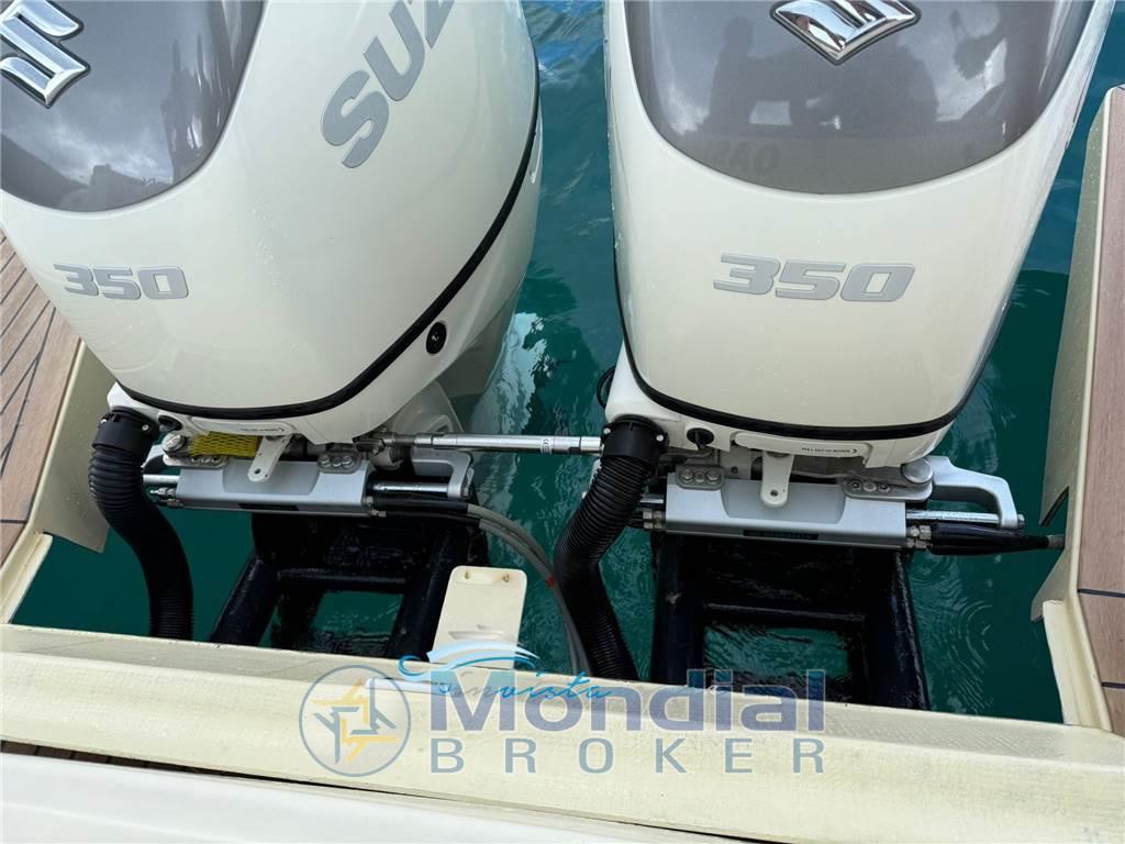 timoneria idraulica Ultraflex 2025, 2 braket; manette elettroniche; eliche dual-prop; prese usb sia interne che esterne; inverter 2000; tutte le luci a led; moquette interna rimovibile e lavabile; sempre rimessato al coperto, in acqua 15 giugno al 15 settembre; compressore per il gonfiaggio dei tubolari, copertura integrale per la notte . 2021 NUOVO : scorrimento pali tendalino posteriore, a copertura di poppa in bimini crema, spiaggetta nuova in flexitec , scaletta, impianto idraulico con posizionamento cassone per l’acqua a poppa 200 litri, rivestimenti in pelle dei tientibene, fuochi cucina. Interni impianto audio di nuova generazione con sistema Glauk con due zone interne ed esterne impianto invisibile con eccitatori, tubi corrugati motori, gavoni di poppa stagni ; 2024 installati 2 Suzuki 350 uno del 2019 e uno 2023 ; 2024 NUOVO: elica di prua, GPS e plotter Garmin, impianto elettrico ; 2025 NUOVO: aria condizionata Frigomar, WC, timoneria idraulica Ultraflex.