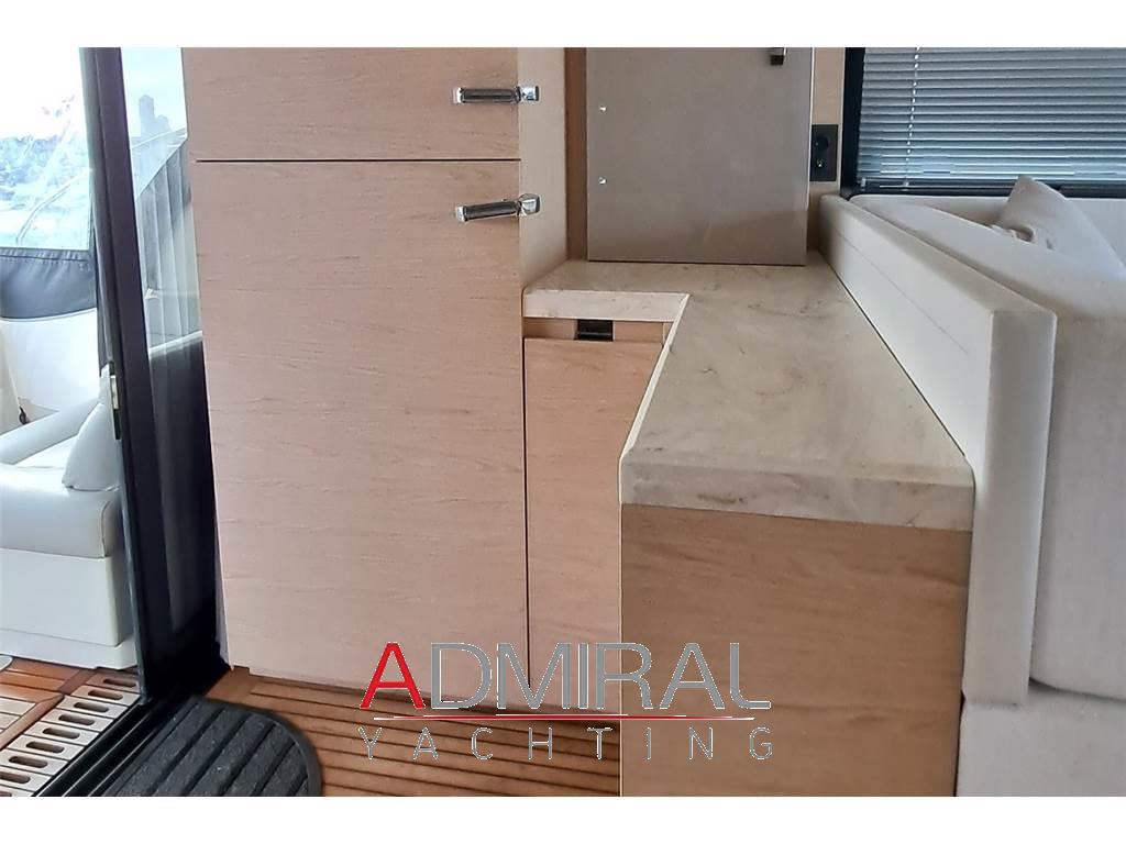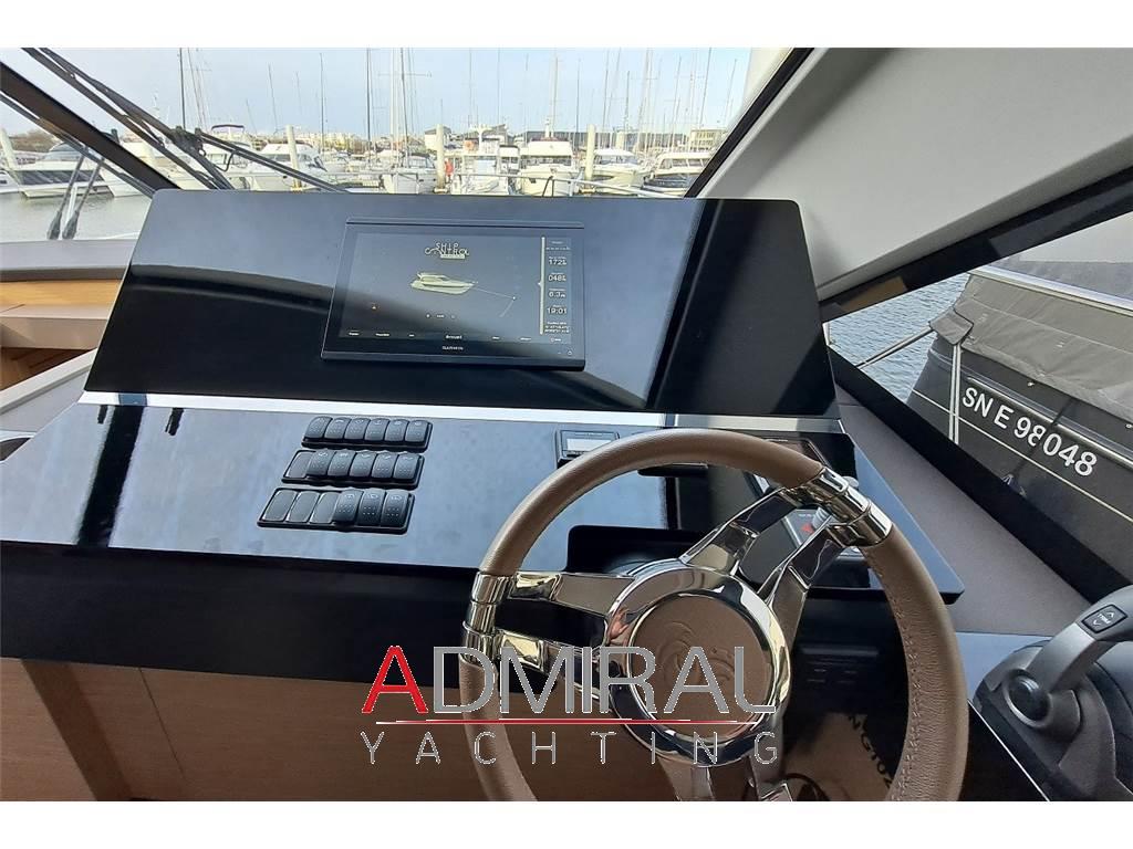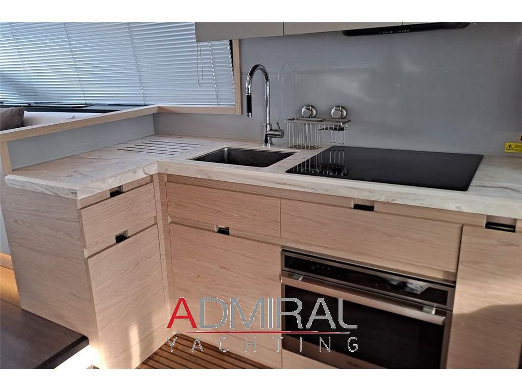 Ponte Principale con cucina posizionata strategicamente tra il pozzetto e il salone. Aprendo la vetrata, si crea un'unica area conviviale. È dotata di piano cottura in vetroceramica, forno, frigo con congelatore a colonna e ampi spazi di stivaggio. Verso prua si trova l'area living con un grande divano a "U" e un tavolo da pranzo. Le enormi vetrate laterali offrono una vista a 360° e molta luce naturale. Plancia di comando situata a dritta, integra il sistema Ship Control con i display Garmin per la gestione totale della barca.