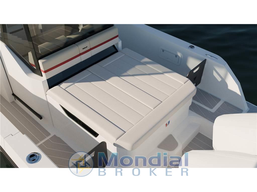• Zona Poppiera Versatile: Un ampio prendisole di poppa invita al relax, ma nasconde un segreto: al di sotto si trova una comoda cabina con due posti letto, perfetta per weekend fuori porta o riposini pomeridiani.