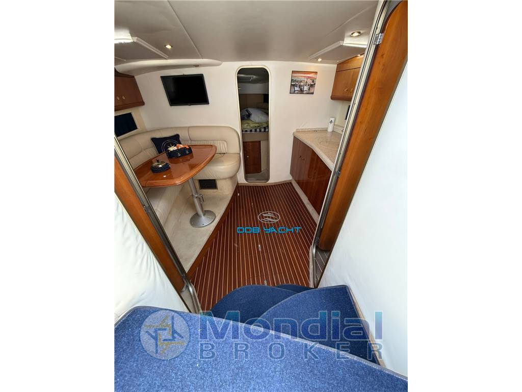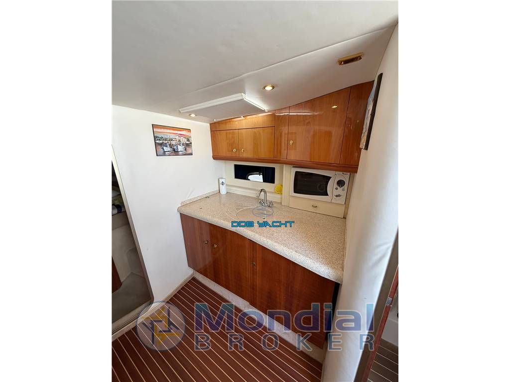 2 CABINE, 1 BAGNO; cabina armatoriale a prua, dinette con tavolo convertibile a SX con tv LG, cucina a DX con lavabo, n* 2 fuochi a gas, forno a microonde WHIRPOOL, frigo, cabina di poppa separata con letti in piano, locale WC separato con pompa di acque grigie; ampio pozzetto di poppa con divano ad U e tavolo, mobile living con lavabo, divano lato sx contrapposto alla seduta pilota, ampio prendisole di prua.