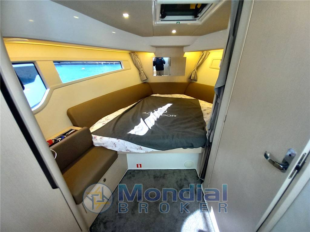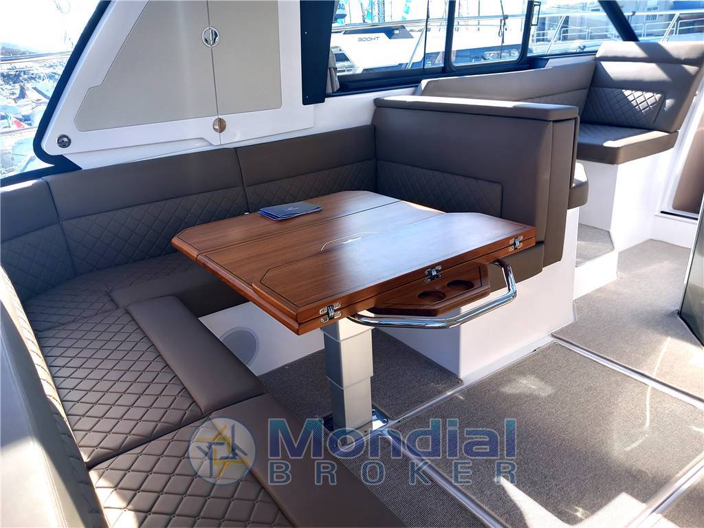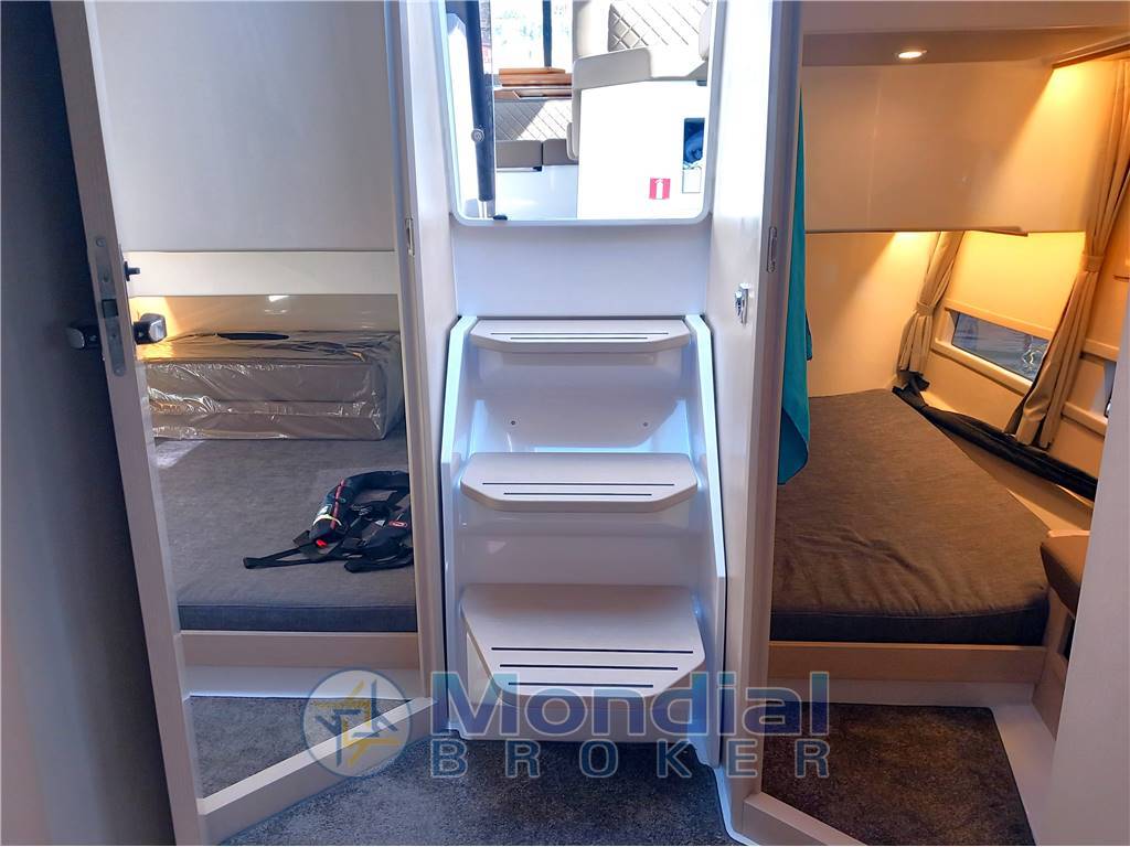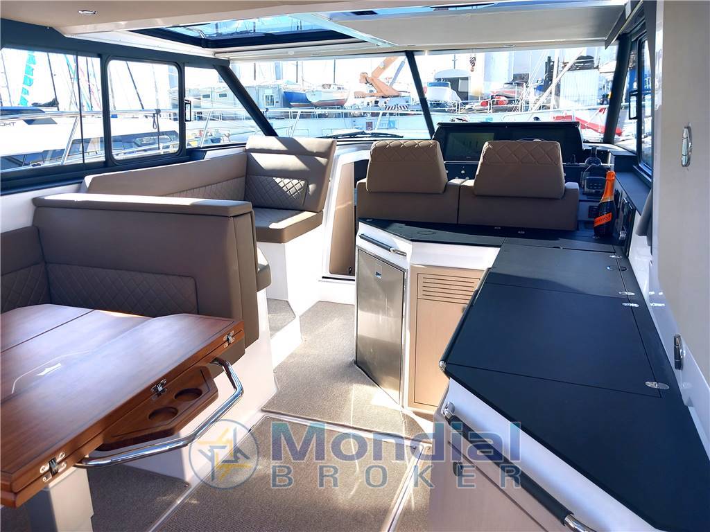 Sul ponte principale sotto al grande Hard-Top apribile elettricamente troviamo un ampio divano con grande tavolo sulla sinistra e cucina sulla destra, verso prua postazione di guida con strumentazione completa e sulla sinistra altre sedute trasformabili in chaise longue. Ampissima plancetta di poppa con altro comodo divano e tavolo abbattibile elettricamente che si trasforma in prendisole. A prua altro grande prendisole con schienali regolabili.