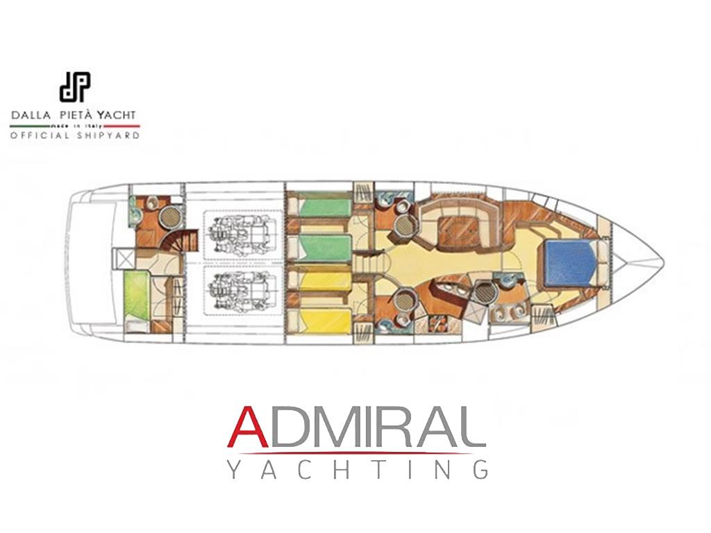 2 Doppia in piano, 1 Matrimoniale italiana, 1 Cabina equipaggio, 3 Toilette. Persone trasportabili: 12.